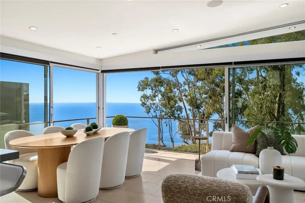 Magnificent views of the Pacific Ocean, Catalina Island, shimmering white water, colorful sunsets and sparkling evening lights lend enchantment to every occasion at this upgraded architectural showplace in Laguna Beach. An exceptionally rare double lot allows ample room for an enviably private backyard at the rear of the home, extending the main level to an entertainers oasis with a step-down dining patio, fireplace, water wall, and a built-in BBQ bar. From cocktail parties, birthdays and holidays to relaxing on a wraparound deck, the open and airy residence elevates lifes special moments to an impressive new level. Grounds are beautifully maintained and display an inviting front yard with an attached two-car garage. A translucent glass entry door provides a modern introduction to the home, which spans approximately 2,152 square feet over two levels and features four bedrooms, three baths, and two living areas with ocean views through floor-to-ceiling windows. Vaulted ceilings, interior and exterior whole-house audio, motorized shades and high-end lighting fixtures add convenience and elegance throughout. Open-concept style graces a designer kitchen that is distinguished by quartz countertops and custom wood cabinetry, and stainless steel Monogram appliances ease prep for meals and parties. Refresh stylishly in the homes luxurious primary suite, which is appointed with a spacious fireplace-warmed deck, and a spa-inspired bath with vessel sinks and lacquered wood cabinets. Tennis courts at Moulton Meadows Park are close to home, and the neighborhood is moments from hiking tr