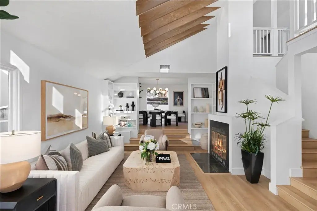 Nestled in the hills of Laguna Beach, this exceptional home on a double lot offers a serene retreat with breathtaking views of the Pacific Ocean, Catalina Island, and shimmering city lights along the coast. Step beyond the charming gated entry to discover a thoughtfully designed residence filled with character and warmth. The living room boasts stunning natural light streaming through two-story vaulted ceilings with exposed wood beams, creating an inviting ambiance enhanced by built-in bookcases and a cozy wood-burning fireplace. The newly remodeled kitchen features a highly functional layout, complete with quartz countertops, updated appliances, ample storage, and a large pantry. An open cut-out connects the kitchen to the dining area, while the adjacent family room/den opens to a private patio through French doors, perfect for al fresco dining, BBQs, or gardening. The main level also includes a versatile sunroomoffering an additional squarefootage for a home office, workout area, or children's playrooma bedroom with an en-suite walk-in shower, and a laundry room with built-in shelving, washer, and dryer. The upper level offers a tranquil primary suite with ocean views, a private balcony for watching sunsets, and a spa-like bathroom with dual sinks and an oversized jetted tub. Two additional bedrooms, a full bathroom, and a quaint private balcony complete this serene space. Additional highlights include a whole-house water softener system, a spacious 2-car garage with a workspace and cabinetry, and a driveway accommodating two more vehicles. Tennis courts at Moulton Meadow