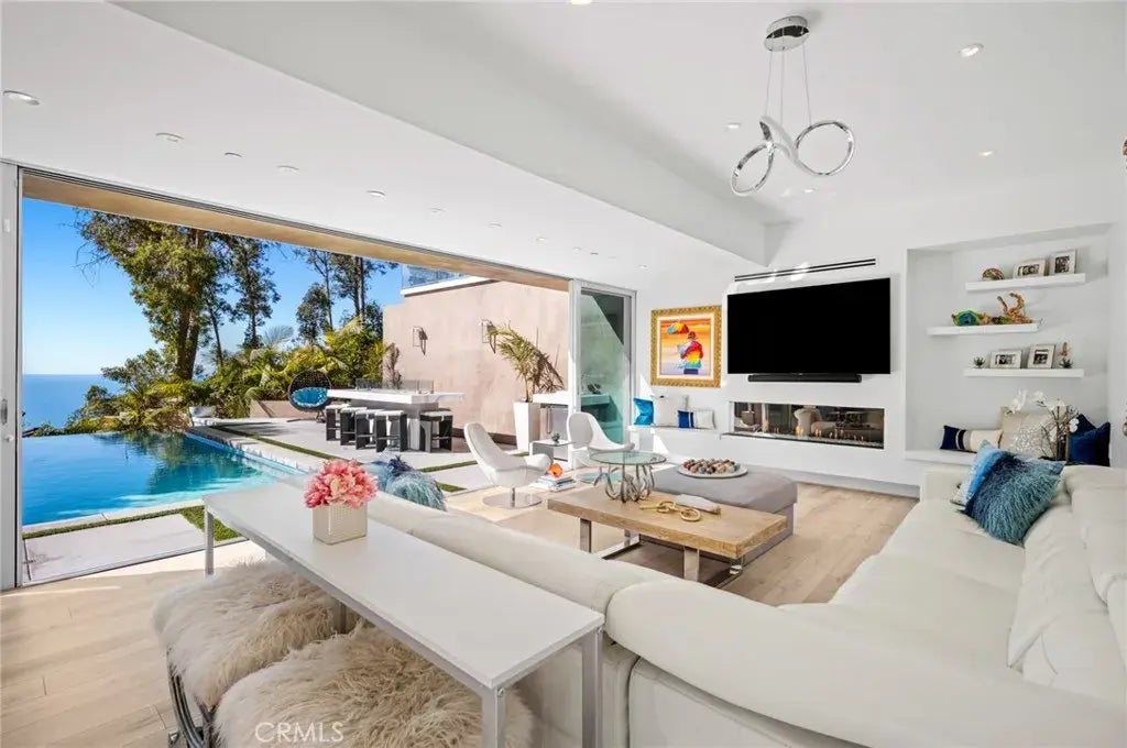Breathtaking views of the Pacific Ocean, dramatic coastline, Catalina Island, rolling hills and evening lights are enjoyed from this iconic Mark Singer-designed custom contemporary pool home in Laguna Beach. The exquisitely upgraded and expanded residence resides behind the gates of Sommet Du Monde at the top of Laguna Beach, where only seven homes share this remarkably private setting. Panoramic views are enjoyed from both levels of the estate, with large decks and a fabulous backyard extending living areas into the outdoors. Approximately 3,855 square feet, the four-bedroom, four-bath showplace is impressive yet inviting, providing ideal settings for friends and loved ones to share good times, great meals and memorable special occasions. Ocean views greet everyone upon entering the exceptionally light and open home, which is primed for entertaining with large living areas that open to a grand ocean-view deck, and a newly remodeled kitchen that is anchored by a double-waterfall island with under-counter beverage refrigerator, an ice maker, quartz countertops, sleek white cabinetry and a secondary catering kitchen. Two Fisher & Paykel dishwashers, a full-size wine refrigerator, Sub-Zero refrigerator and a Viking range with pot filler make this a true chef's paradise. Floor-to-ceiling walls of glass, multiple fireplaces and bespoke finishes and fixtures shine throughout. Solar power with two Tesla batteries, an attached street-level two-car garage, and a main-level secondary primary suite with a fireplace and an ocean-view balcony overlooking the backyard are also featured.