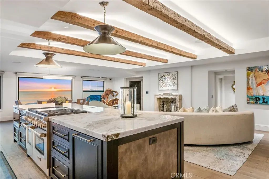 Commanding breathtaking panoramas of the Pacific Ocean from nearly every vantage point, this residence seamlessly integrates contemporary, sophisticated interiors with the quintessential outdoor coastal living. Recently reimagined with meticulous attention to detail, the floor plan spans just over 2,800 square feet, offering two bedrooms and two-and-a-half bathrooms. The richly layered finishes create an elevated living environment, with imported Turkish stone, reclaimed wood-plank flooring, handcrafted millwork, and bespoke lighting celebrating craftsmanship throughout. Accessed from the street level via a custom glass elevator, the principal living area features stunning ocean vistas, a main sitting section with a fireplace, and the homes dining portion set against a picture window. A Dutch door connects this space with one of the numerous outdoor areas. Anchored by a stone-top island, the open-concept kitchen offers every high-end amenity, from bespoke cabinetry, a slab backsplash, and an integrated high-end appliance package inclusive of a professional-grade six burner Wolf range with double ovens and a griddle to a farmhouse sink. Clad in a muted palette, the rear living space on this floor is a quiet retreat that leads onto the backyard: a lush sanctuary with a pool, sitting area, and fountains - truly an oasis in the city. A secondary bedroom with an adjacent bathroom and a generously sized walk-in closet round out this level of the home. Perched atop the residence, the primary suite is a statement of its own. Offering textural depth, its wood-paneled ceiling melds w