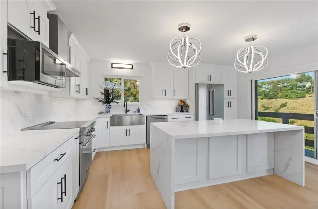 Situated on an large lot with beautiful Canyon Views, this 3 bedroom, 3 bath home has recently completed an partial interior remodel of a brand-new kitchen with new cabinetry, Calcutta quartz countertops and waterfall island, new Thermador appliances, GE microwave, and a farmhouse sink. The floors are new vinyl flooring throughout and the sliders & windows have also been newly replaced. The main floor has beautiful, open, and expansive views of the canyon with a partial ocean view for everyday living. One bedroom or office is upstairs and downstairs are 2 good sized bedrooms and baths. Short distance to renowned restaurants, stunning beaches, sandy coves, hikes, galleries, museums and more.