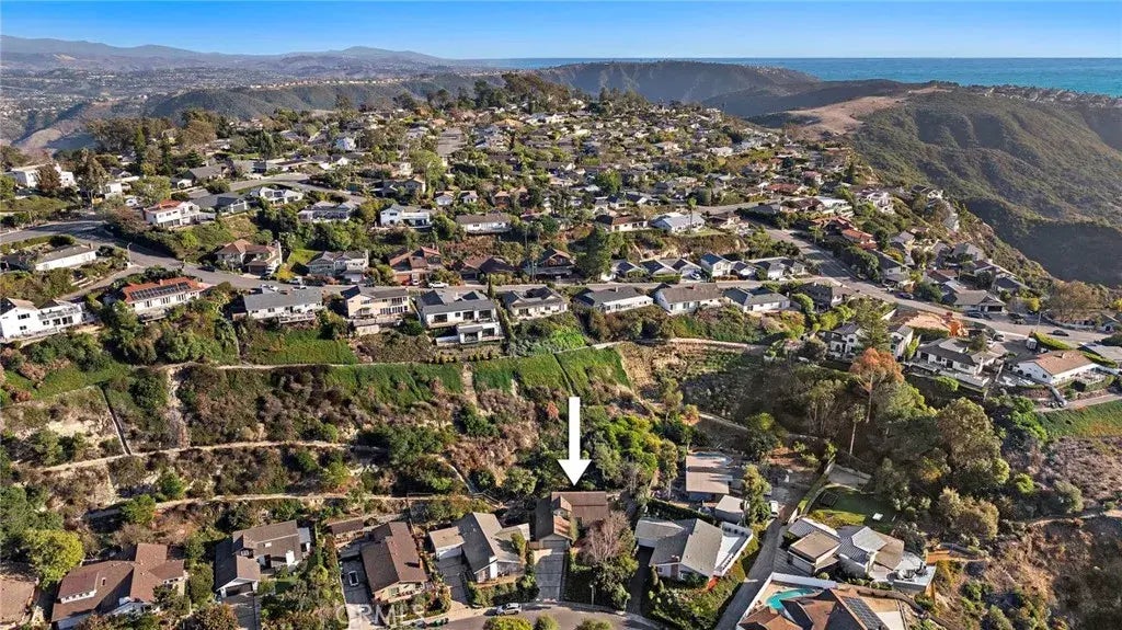 Situated on over half an acre in desirable Top of the World, this wonderful five bedroom home is tucked away on a serene corner of Bern Drive. The spacious lot features a private hillside setting and abundant outdoor space. Front and side yards wrap around to a sizeable rear patio and yard area. Comfortable floor plan allows flexibility for single level living with all primary conveniences on the main floor, including no steps from parking to the interior. Inviting front double door entry features an open foyer, leading to dedicated dining and living rooms. The sizeable living room features a gas fireplace and enjoys abundant natural light from high vaulted ceiling and multiple windows. Granite kitchen features custom cabinetry, stainless steel appliances, bar top seating and ample room for another dining set or den seating. From the kitchen, French doors lead to the scenic rear yard and hillside. All bedrooms enjoy green scape views and have dedicated sliding door closet storage. The main floor Primary suite has large walk in closet and remodeled bathroom with tiled shower. There is an additional main floor bedroom and half bathroom on the main floor, as well as three additional bedrooms upstairs that share a remodeled bath. Upgraded dual paned windows, French doors and hardwood flooring are featured throughout. A dedicated laundry room is conveniently located just off the direct access garage entrance. Ample parking for up to six cars via lengthy driveway and two car garage. Enjoy close, easy access to the best that Top of the World and Laguna Beach have to offer, includi
