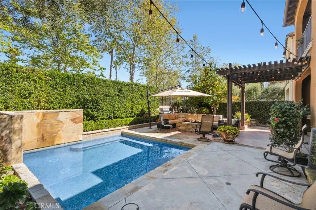 Coveted estate property overlooking the 18 hole Jack Nicklaus-designed golf course of Aliso Viejo Country Club, 27 Santa Barbara is arguably one of the finest homes to be offered for sale in Aliso Viejo. From its private view and corner lot locale, to the finely finished interior and five star outdoor experience with spool and outdoor dining space, this home is one to impress. As you enter the property, you will pass through an enchanting outdoor covered room with lush plantings that separates the detached casita from the main house. The main floor presents a spacious great room, featuring a gourmet dream kitchen anchored by top-of-the-line appliances, double ovens, quartz countertops, plenty of seating at the large center island, and a butlers pantry with plenty of storage. This opens to a large family room with a raised hearth fireplace, there is an eating area as well as a formal dining room, all presented amongst custom barn wood flooring. Upstairs features three bedrooms, an office and a spacious bonus room. The oversized primary suite features numerous windows for maximum light, a tray ceiling and glass doors opening to a shady covered deck with views forever and ever. The spa-like bathroom includes dual vanities, a large soaking tub, a separate walk-in shower, and a large walk-in closet. Dual zoned AC are also present for maximum comfort. The home has only one neighbor allowing for total privacy. Charming planters are filled with citrus trees and decorative landscaping providing tranquil vignettes for dining al fresco under a covered space complete with fireplace, fi