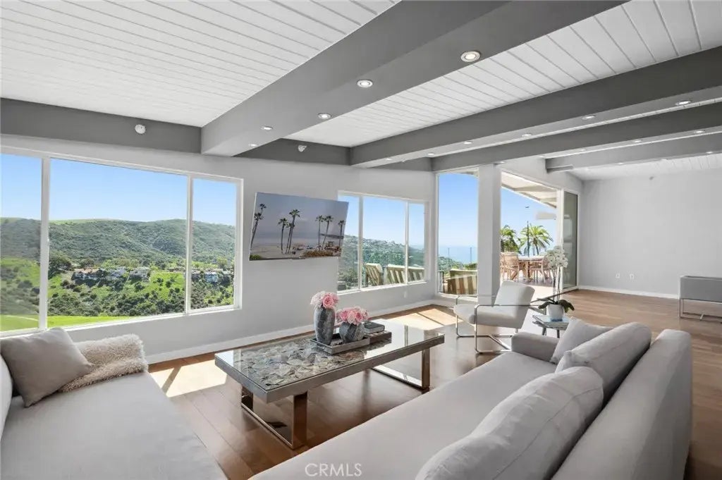 Discover coastal luxury at its finest with this stunning 5 bedroom, 4.5 bathroom contemporary residence in Laguna Beach. This breathtaking home seamlessly combines luxury with modern design, offering sweeping canyon and ocean views. Spanning 3,589 square feet, this architectural masterpiece blends indoor-outdoor living with elegance. Step through the grand foyer, illuminated by natural light, into an open-concept main level. Upon entry, youre greeted by stunning Brazilian Walnut hardwood floors and high beamed ceilings creating an inviting ambiance. The gourmet kitchen is a chefs dream featuring Caesarstone Quartz countertops, a commercial-grade gas stove and a Viking refrigerator. The main floor is home to the luxurious primary suite with its own private balcony, oversized walk-in closet, and a spa-like 5-piece ensuite bathroom. Two additional guest bedrooms and a full bath complete the main level, while the open living and dining areas are perfect for entertaining. Expansive glass sliders frame breathtaking vistas and ocean breezes into the main level. Downstairs, youll find two bedrooms complete with ensuite bathrooms and walk-in closets. Additionally, there is a versatile space that could serve as an office, gym, or additional living room. This level leads to a flat backyard designed for outdoor entertaining. The property also features a multi-car circular driveway with space for 5 additional cars and a two-car garage with direct access for added convenience. With its unmatched style, stunning views, and ideal location, this Laguna Beach gem offers the ultimate coastal