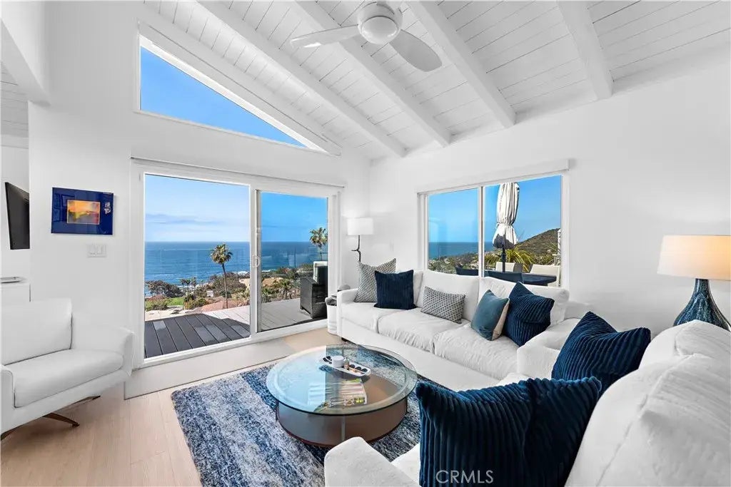 Welcome to your dream coastal retreat at 21657 Ocean Vista Dr, nestled in the picturesque hills of Laguna Beach, just a short stroll to some of Laguna's world-renowned beaches. Located within a gated community, this exquisite residence offers breathtaking 180 unobstructed panoramic views of the ocean, white water, sandy shores, and rugged cliffs, from every room. Experience incredible sunsets, with spectacular views of Catalina Island and the captivating ocean landscape. Completely remodeled in 2020-21, this home epitomizes luxurious living in one of Southern California's most coveted locations. As you step inside, you'll be captivated by this rare corner property featuring three bedrooms and an open floor plan that seamlessly blends indoor and outdoor living. The spacious living area is filled with natural light, while large sliding doors and windows perfectly frame the stunning ocean vistas. Enjoy cozy evenings by the fireplace, or step out onto the expansive wraparound deck to savor magnificent sunsets and twinkling coastal lights. Both the living area and all three bedrooms feature extended and upgraded decks finished with all glass railings. The upper deck wraps around the corner, offering ample space for entertaining, seating, and a large outdoor dining table. The kitchen is a chef's delight, equipped with stainless steel appliances, quartz countertops, custom cabinetry, a generous walk-in pantry, and an extended counter for seatingperfect for entertaining. The dining area offers an elegant space for hosting family and friends while enjoying the picturesque views. Ret