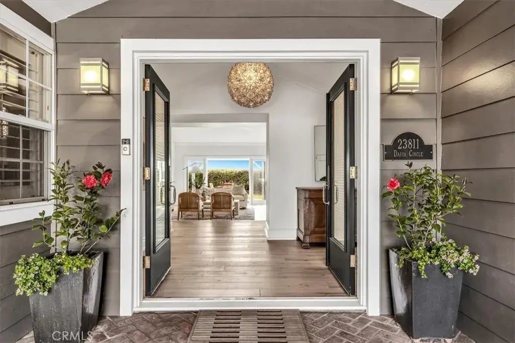 Incredible Single-Level Beachside Retreat in Niguel Shores. Tucked in a quiet cul-de-sac within the prestigious gated community of Niguel Shores, this rare detached single-level Terrace home offers 5 bedrooms and 3 bathrooms over 2,922 SF on a 7,920 SF lotjust moments from the sand and water. Charming curb appeal includes pitched roofs with crisp white trim, a storybook garden fence, and a red-brick walkway leading to grand double glass doors. Inside, a striking glass light fixture illuminates the entryway, gracefully framed by open half wallsperfectly suited for displaying art or elegant accent pieces. The living room features hardwood flooring, high ceilings with crown molding, and French doors that open to a serene backyard. A dual-sided fireplace anchors the space, offering warmth and ambiance to both the living and adjacent areas. The entertainers kitchen with black soapstone counters, glass-front cabinetry, a Viking range, Sub-Zero fridge, dishwasher, a breakfast bar peninsula for casual dining, and full wall of cabinets and pantry. A marble-topped island includes a second oven and beverage fridge. The dining area flows into a spacious family room with built-in desk and backyard views. Off the dining room access to the attached garage, which includes a 220V Tesla charger. Sliding doors open to a paved side yard with heated outdoor shower-ideal after beach outings. An additional bedroom or flexible bonus room sits just off the dining, while across the home French doors reveal a private home office with built-ins. A nearby guest bath features a walk-in stone and tile sh