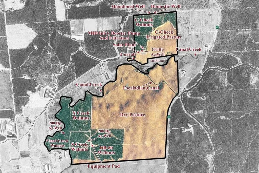 Prime Agricultural Investment Opportunity!! This exceptional 1,002.70-acre ranch features 6 closely aligned, non-contiguous parcels with diverse agricultural potential. The property include 336 acres of productive walnut orchards, primarily Chandler variety with approximately 60 acres of Tulare variety, demonstrating consistent strong yields. In addition, there's 85 acres of irrigated pasture suitable for livestock operations. Furthermore, there's 581.70 acres of gently sloping native pasture, offering expansion and potential. Water Security is 161 acres within the coveted Merced Irrigation District with reliable groundwater supplies. The remaining acreage in the Amsterdam Water District with potential for additional surface water access Additional Assets including the Modest livestock corrals and the leased solar plant. This property presents a rare opportunity to acquire substantial acreage with established permanent crops, reliable water resources, and diverse agricultural potential in a prime California growing region.