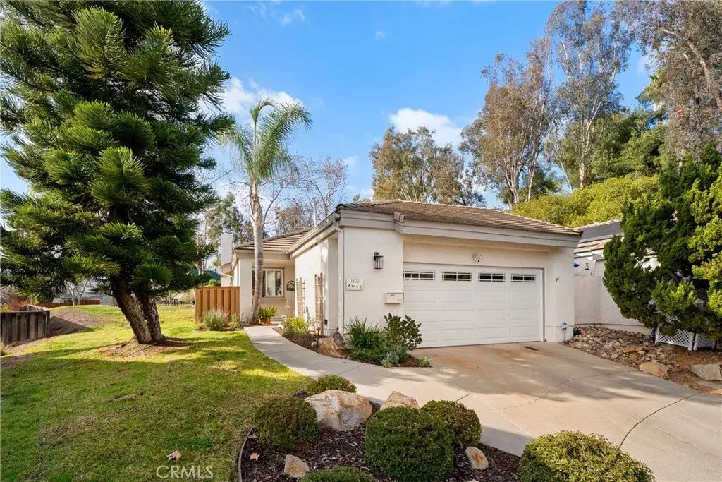 Welcome to 1802 Castle Glen. From the private courtyard entry, to the thoughtful updates, well-designed floorplan, cul-de-sac location, and OWNED solar, this 2 bedroom, 2 bathroom condo in the View Terrace community is the perfect place to call home. Upon entering you are greeted with updated paint and luxury vinyl plank flooring throughout. The comfortable living and dining areas, with access to the patio, offer the perfect space to relax or entertain. Cooking is easy to do in the bright, spacious kitchen featuring granite countertops, stainless steel appliances (including gas stove), and ample cabinetry. Retreat to your primary suite complete with custom-built closets, vaulted ceilings, dual bathroom sink vanities and access to the patio. The second bedroom and private bathroom is perfect for kids, guests, or those that work from home. Relax after a long day on your private, beautifully landscaped and crafted patio. Just out front is the attached, two-garage which includes extensive storage space and laundry facilities. Additional recent updates include: complete gas fireplace remodel; primary bath shower conversion; exterior paint; rain gutters; sprinkler system; electric heat pump/AC system; and garage door/opener. View Terrace is a quiet, family/pet friendly, well-maintained community surrounded by lush trees and landscape. The community boasts a sparkling pool, basketball and tennis courts, grassy areas and paths to run and play. Living in southwest Escondido, near the 15 freeway, means you are just minutes from Lake Hodges, nearby hiking trails, and many dining, shop