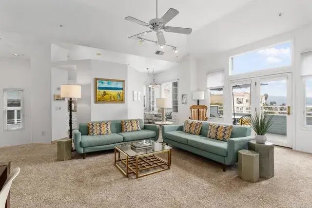 This contemporary 2 bedroom-2 bath town home is situated in a highly desirable location in Solana Beach. It is located west of I-5 freeway with immediate and convenient access at Via de la Valle. One block across from the Del Mar Racetrack and at the end of a cul-de-sac with minimal traffic. This is quiet complex and is a short walk to Del Mars dog beach, numerous restaurants and the Cedros Shopping district. The town home features a primary bedroom downstairs, with access to a charming patio directly through the French door. The walk in closet provides plenty of storage. The primary bath features a large soaking tub, with dual sinks and a generous sized shower.It also has a private commode. The upstairs bedroom has 2 queen size beds, its own bath, a large walk in closet and a balcony. The living room is open with beautiful views out to the patio and a large deck which has a barbecue ,full sized table and chairs for 4 which you may dine al fresco and/or use for entertaining guests. The kitchen has a lovely breakfast nook , all accoutrements for cooking up a delicious dinner, including a new LG refrigerator. Additional features are a two car direct access garage, laundry and the complex has a pool and spa and guest parking. Please call for available dates starting December 7th, 2022. You could rent till June or July 1, 2023.