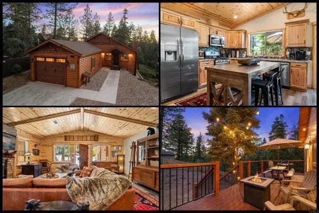 Welcome to an exclusive opportunity to own a luxurious, single-level cabin in the heart of Big Bear! Nestled in the sought-after Moonridge area, this remarkable home offers the perfect blend of modern convenience and rustic charm, making it an ideal home away from home for personal enjoyment or as a lucrative rental property. Built in 2020, this single-family, log-style construction home with knotty pine accents boasts 1,603 square feet of living space, featuring 3 bedrooms and 2 full bathrooms. The inviting great room is complemented by a cozy fireplace and large windows with pull-down blinds, allowing abundant natural light and beautiful views of the mountain landscape. The gourmet kitchen is a chef's dream, complete with hickory cabinetry, granite slab countertops, stainless steel appliances, and a charming cedar breakfast bar. With no stairs to worry about, bringing in groceries during the snow is a breeze. Slider doors from the dining area open to a spacious deck, perfect for entertaining or unwinding, with a jacuzzi and picturesque mountain views. The private backyard is enclosed by a full wraparound fence, tastefully added by the owners in 2020. Two generously sized secondary bedrooms share a beautifully appointed bathroom with oil-rubbed bronze fixtures and slate tile, while the master suite offers a private retreat with a large closet, ceiling fan, and an ensuite bathroom with dual sinks and tasteful upgrades. For added convenience, a washer and dryer are included, tucked away in a hallway closet. The detached 576 SF two-car garage features air conditioning and off