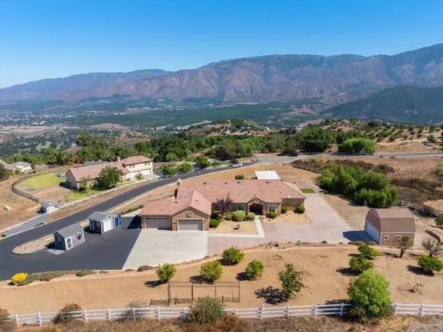 Wake up to breathtaking panoramic views every day in this turnkey home, where every window frames a masterpiece of nature's beauty. Situated on just under 3 acres overlooking the entirety of Pauma Valley, this 4 bedroom 3 bath house allows for significant parking and storage with its attached 4 car garage, and oversized tuff shed offering additional garaged parking. Enter into the formal living area, where you will see prominent views of Palomar Mountain. Formal dining is just off of the large kitchen featuring an island with bar seating, plenty of storage, RO system, and granite countertops. Two bedrooms share a Jack and Jill bathroom, while the guest suite offers its own private bathroom. Enjoy the same remarkable views from the jacuzzi bathtub in the master bathroom, which also features and oversized walk in closet. The fully fenced and gated lot offers endless potential, but already holds a fully owned solar system, which provides plenty of power to run the dual climate A/C system all summer long. The irrigated orchard contains citrus trees and a large variety of other fruits. The large outdoor patio and kitchen area makes entertaining a breeze. RV or trailer parking is plentiful on the East side of the home.