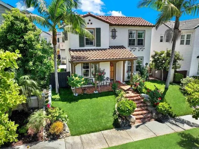 This is it! A beautiful, exquisitely priced Spanish-Mediterranean, 3 Bed/2.5 Bath home atop an elevated lot on a quiet, less-travelled street in the vibrant, eclectic community of Bressi Ranch! Freshly painted inside and out, this recently renovated home with solar power is charming, spacious and bright. Professionally designed landscaping with Saltillo tiles on the stairs & covered porch out front, mature gardenia bushes and highly fragrant hybrid roses throughout give off the most intoxicating fragrances when in bloom. Prolific fruit trees - Fuyu persimmon, peach, plum trees abound on the property which has irrigated areas for organic gardening on the sides. Entering, you have the living room/optional den and formal dining room on both sides, and as you walk towards the newly renovated kitchen, there is yet another dining space which opens up to the family room which has a built-in stereo surround sound system which extends into the courtyard (newly epoxied) with custom grilling area and gas cooktop for outdoor cooking. The stairs, as well as bedrooms and hallway all have gorgeous Brazilian Engineered hardwood flooring throughout, with genuine Pakistani Red Onyx stone tiles on the bathroom floors. Additional window was added to the family room, improvements in 2024 include interior and exterior painting, additonal gutters, new water heater, kitchen and bathroom renovations with addition of new lightings, toilet and plumbing fixtures in some bathrooms. Bressi Ranch, coveted for its sense of community, stellar amenities, and proximity to excellent schools, continues to be t