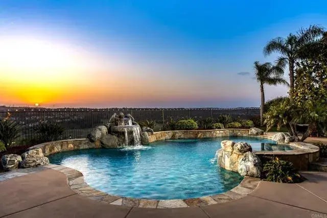 STUNNING VIEWS within the exclusive La Costa Greens community, this remarkable home offers a front-row seat to some of nature's most captivating displays. Perched on a premium view lot, it boasts panoramic vistas that stretch from the sparkling ocean to the lush golf course and beyond to the tranquil lagoon. As you step inside, you're greeted by warmth and comfort in timeless finishes like maple wood floors and travertine tiles. Built-in his/her desk and walls of cabinetry make the den a perfect home office. Cozy fireplaces highlight the living and family rooms. Gorgeous built-in cabinetry can be found in the formal dining room and family room which also boasts a media center. Surround sound system fills the living, family, loft, master suite & backyard. Large windows frame every room, inviting the outside in and ensuring you never miss a moment of the stunning sunsets that paint the sky. The heart of the home is a chef's kitchen, featuring granite countertops, GE stainless steel appliances, walk in pantry, butlers pantry, eating area and a spacious island. Entertain with ease in the formal dining room with built-in cabinet, which overlooks a serene courtyard complete with a cozy outdoor fireplace and a soothing fountainan idyllic setting for al fresco gatherings with friends and family. First floor bedroom with full bath and backyard access is perfect for guests or multi-generational living. Upstairs a spacious loft with built-in offers versatility for a play area, media room, gym or additional living space, as well as 2 additional bedrooms with one being ensuite. The laun