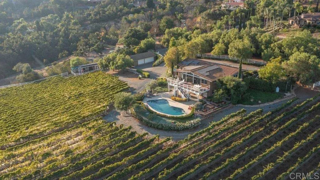 Experience ultimate country living in this unique opportunity to own your dream home set against the backdrop of your very own lush vineyard. This split-level custom adobe - built home combines rustic elegance with modern amenities designed for indoor/outdoor living. A stunning grand ornamental iron double door greats you and starts your captivating experience. You will find yourself awed by the 100-year-old reclaimed barn wood siding floors. The entry level offers an open floor plan with formal living room featuring a cozy beehive fireplace and high vaulted wood ceilings throughout. Culinary enthusiasts will love the well appointed kitchen featuring top of the line SS appliances including a sub-zero refrigerator, 6 burner Wolf stove custom cabinetry with abundant storage, Carrera marble counter tops and walk-in pantry. The primary bedroom en-suite sink boasts customize the shower, dual sink, and sleek cabinets. French doors leading to your private sitting area. A guest bedroom (currently being used as office). Hallway bathroom with soaking tub. Spacious family bonus room and outdoor 10x30 Trex Deck to enjoy spectacular sunsets and outdoor entertainment. A wood staircase leads you to 2 large guest bedrooms, both with covered patio, pool and spa access. A unique feature is the hidden wine room with beautiful iron door to store your favorite wine bottles. The (approx) 5 acre vineyard is irrigated by efficient drip irrigation. Organic Merlot and Cabernet Sauvignon are the varieties of the grapes. Outdoor features included pool/spa, lush landscaping, a captivating water fountai