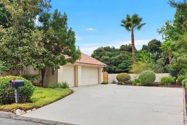 Welcome to your dream home at 3201 Alamo Glen in South Escondido. This impressive 4-bedroom, 3-bathroom residence spans 2,700 square feet of luxurious living space, ideal for entertaining. Positioned at the end of a tranquil street, this home offers unparalleled privacy and serenity. Upon entry, you are welcomed by custom tile flooring leading to a formal living room and a separate dining room, perfect for hosting dinners. The updated kitchen is a chef's dream, featuring a large bay window with views of the meticulously manicured backyard, Corian countertops, an electric range, a wall oven, a built-in microwave, a built-in wine fridge, and a generous pantry for all your storage needs. The inviting family room features a wet bar and a cozy wood-burning fireplace, ideal for gatherings. With three fireplaces throughout the home, warmth and ambiance are guaranteed. One bedroom and a full bathroom are conveniently located downstairs, while the upstairs houses three more bedrooms, including the primary suite with its own fireplace. The primary suite also boasts a charming den, perfect for an office, TV room, or reading nook. Step outside to a picturesque backyard featuring a sparkling pool with custom water feature and spa. The expansive yard, shaded by mature trees, offers a pergola for alfresco dining, beautifully maintained lawns, and exceptional privacy. The home is equipped with solar panels, 220 Volt in garage, blending luxury with sustainability. The three-car garage and spacious driveway provide ample parking. With easy freeway access, this home offers both convenience an