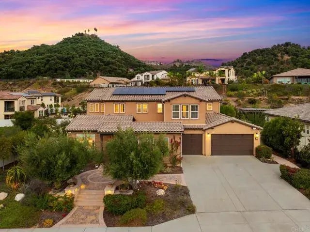Immaculate Plan 4 in the Estates at Canyon Grove! Owned Solar and LOADED with designer upgrades at every turn, this exquisite property offers on open floorplan blending indoor/outdoor living on a half-acre parcel within the picturesque backdrop of Daley Ranch. Built to impress, this home is upgraded with an entertainers courtyard leading into an incredible 4,115 sqft estate featuring 4 spacious bedroom + Loft/Bonus Room, 4.5 baths, Media/Game room and so much more. Chefs Kitchen complete with slab granite countertops, stainless steel appliances, large center island with breakfast bar seating, designer pendant lighting, and a PREP KITCHEN complete with full sized range, refrigerator, sink and two walk-in pantries. Family room with fireplace, surround sound, and bi-folding doors leading to the covered loggia. The Primary Suite offers a private balcony, spa-like bath with a walk-in shower with Roman shower head and jacuzzi tub. In addition to the upstairs Primary, youll find a versatile loft and two additional guest suites. Step outside to a serene backyard oasis with covered loggias, mature landscaping, tiered fountain, all set on an approximately half-acre lot (0.48 acres). Additional highlights include porcelain tile flooring downstairs, designer carpeting in bedrooms and upstairs, full bed/bath downstairs, 3-car garage, and a convenient upstairs laundry room. Dont miss this opportunity to live in the best of the best at Canyon Grove.