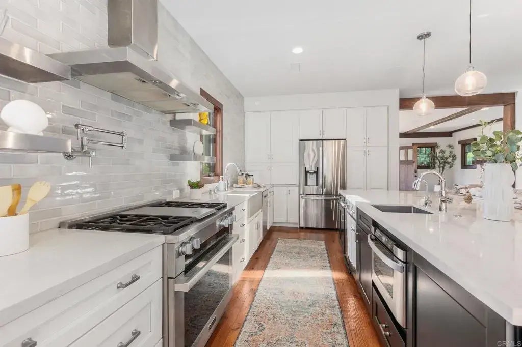 Elegant Private Craftman Compound in Prime Location. Experience the perfect blend of style and functionality in this private half-acre haven. This remarkable property features a single story 3-bedroom main home and a charming 1-bedroom guest house, ideal for guests or rental income. As you approach, you'll appreciate the curb appeal, private electric gate, expansive driveway for additional parking and oversized garage. The sprawling grounds offer plenty of room for RV or boat parking, future pool or additional ADU. The main home was newly built in 2016 with thoughtful and high-quality finishes throughout. Inside, youll find Amish hand-scraped hardwood flooring, solid wood doors, motorized window shades and large casement windows that bring in natural light. This home also offers a whole house water filtration system, whole house speakers, and security cameras for peace of mind. High ceilings, motorized window shades, electric fireplaces and designer lighting enhance the ambiance throughout the home. The award-winning La Cantina bi-fold doors and elegant French doors create a seamless flow between indoor and outdoor spaces. For those who love to cook, the kitchen is a true highlight, featuring beautiful custom hand-crafted Italian tiles, shaker cabinetry, and a generous quartz island with full size prep sink with instant hot water and a beverage fridge. Top-of-the-line stainless steel appliances, including a Miele 36-inch range, Bosch dishwasher, microwave drawer, a pot filler, and a trash compactor, which make this kitchen a chefs delight. The primary suite offers a peacefu