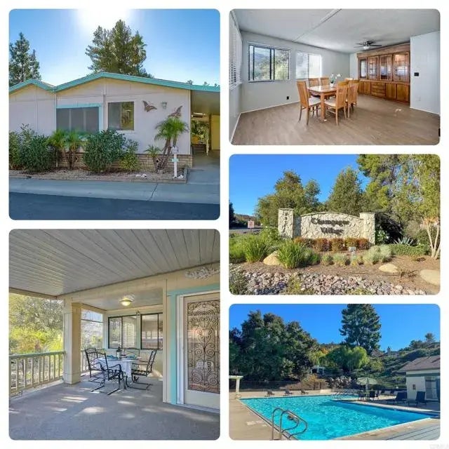 Welcome to Champagne Village, a gated, land-owned 55+ community in North Escondido, where affordable resort-style living meets the beauty of sunny San Diego & its year-round mild weather! This fabulous triple wide home, set on a 433A permanent foundation, offers an open floor plan with fresh interior paint, inside laundry room, luxury vinyl plank flooring & a new mini heating & A/C wall unit for your comfort. The master suite is a true retreat, featuring a spacious primary bath with a newly installed walk-in jacuzzi bathtub (a $20,000 upgrade!). A second bedroom & bathroom provide perfect flexibility for guests or a home office. The kitchen boasts ample cabinet storage & brand-new stainless steel wall oven & microwave. Step outside to your private covered back porch, overlooking a lush, spacious low-maintenance backyardperfect for entertaining, gardening, or simply unwinding with stunning mountain views. Champagne Village offers amenities galore filled with entertainment & social opportunities for all. Dive into the sparkling heated pool for aqua aerobics, stay fit in the gym, or enjoy outdoor activities with horse shoe, tennis, pickleball, & bocce ball courts. Socialize with neighbors through activities like line dancing, card games, billiards, or Bible study. Additional community features car wash station, include free gated RV storage (subject to availability) & a dog park for your furry friends. Best of all, you'll feel like you are on vacation year round! Champagne Village has access to Lawrence Welk Resort, where you may enjoy fine dining, golf, a theater & a farmers