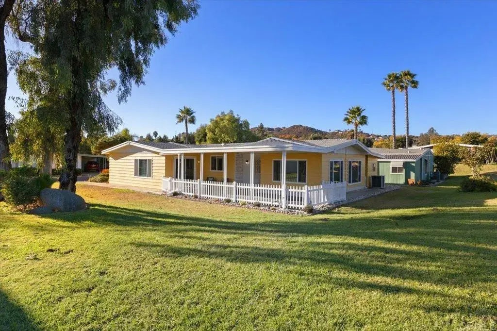Welcome Home to this light and bright home on beautiful greenbelts. A rare ground set, no stair entry makes this home unique. Enjoy the gorgeous remodeled kitchen with newer stainless steel appliances! Recessed lighting in kitchen and primary bath, new ceiling fans, and 40 new jacks/piers, all leveled. Updated bathrooms. Laminate flooring, designer inspired paint throughout interior, and freshly painted exterior. Newer dual pane windows with newer faux wood blinds. Bar area for entertaining & storage. Large Primary Suite with spacious walk closet, and en suite bathroom. Built-in cabinetry in Family Room and Dining Room, and built in desk in Family Room. New dual pane Sliding glass door to large fenced patio facing one of the lovely green belt areas enjoying mature trees. Good sized shed/workshop. Easy Care yard on timed sprinkler system. This is a special light and bright home and you'll love all the windows! Buyers must get park approval. Current Land Lease $1670. Walk to Reidy Creek Golf Course. Vons, CVS, Ross, Starbucks, Restaurants and shops nearby. Just a short drive to Palomar Hospital, Medical offices, Lawerence Welk Dinner Theater, Lake Dixon, Daley Ranch, cinemas and Freeways 15 & 78. Amenities include pool, Jacuzzi, Sauna, Gym, Billiards, Shuffleboard, ping pong, card group and occasional dinners and social activities in the clubhouse. This unique home won't last long, don't miss it!