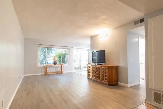 Don't miss this spacious, ground floor unit in a quiet location. Private patio with wood deck, dual-pane windows, 2 walk in closets, carport and dedicated parking space. Laminate and tile flooring throughout. Quartz countertops in kitchen. Primary bedroom includes office/library space. Easy access to laundry room and heated pool. Close to freeways, the beach, restaurants and shopping. Owner pays for water, trash and sewer. No smoking. One year lease with first month's rent and security deposit upfront. Applicant pays for tenant screening.
