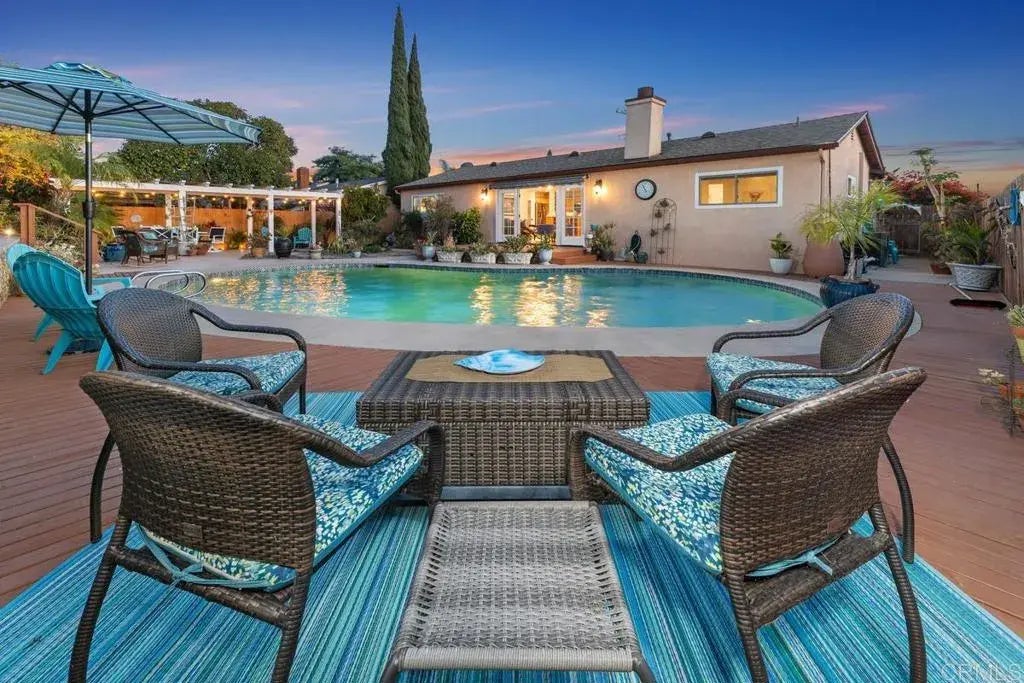 Private Resort Living in Single level home! Step into your personal oasis with this stunningly remodeled 3-bedroom, 2-bathroom home featuring an additional office/den room. This beautifully designed property blends modern upgrades with the warmth of immaculate original hardwood flooring, creating an inviting atmosphere. The spacious great room, complete with a cozy fireplace and well-designed French doors, opens to a sparkling pool surrounded by lush landscaping. Relax and entertain under the shaded arbor, enjoy the deck with views of the serene yard, or step into the private front courtyard, where a tranquil fountain and gated archway set the tone for peaceful living. The primary bedroom, separate from the office and additional bedrooms, includes a rare ensuite bathroom with convenient side yard accessideal for poolside living. Guests will appreciate the backyard bathroom access, perfect for summer pool parties. Additional features include central AC/heat, crown molding, fireplace, granite kitchen countertops, stainless steel appliances, and the added convenience of a raised foundation that allows for easier home maintenance. This property boasts eco-friendly features such as three 60-gallon rain harvesting tanks, a sprinkler system for the front and back yards, and low-maintenance desert landscaping. The oversized driveway and 2-car garage provide ample parking, while the 16 fruit trees add a touch of nature to this entertainers paradise. Pride of ownership shines in this home, located near schools, including Maryland Avenue Elementary, La Mesa Middle School, and Grossmon