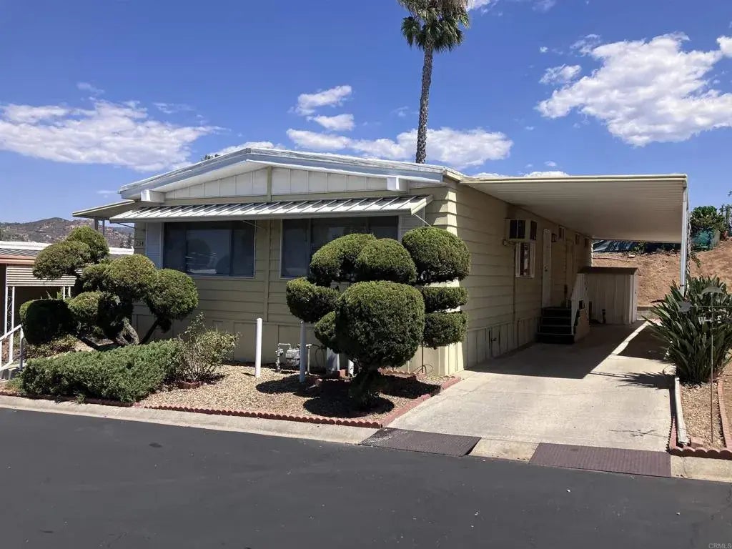 Silvercrest 2BR/2BA home. Freshly painted interior. Comfortable layout with large living room and cozy dining area with built in hutch. Open kitchen with newer faucet and LED lighting fixture. Gas cooking and mini breakfast bar. Hall bath with a skylight, newer flooring and toilet and a walk- in shower with built in seat. Spacious primary bedroom with built-in vanity and mirror closet doors. Primary bath has dual sinks and tub/shower, newer flooring and newer toilets and faucets. Inside Laundry room. Covered carport. Shed. Back of lot is sloped and ready for your creative planting. Front porch on this elevated lot offers neighborhood and mountain views. Park amenities include use of clubhouse, pool, spa, shuffleboard, exercise room, library and community laundry. RV parking subject to availability. Park is next door to Vons. No busy streets to cross to go shopping!