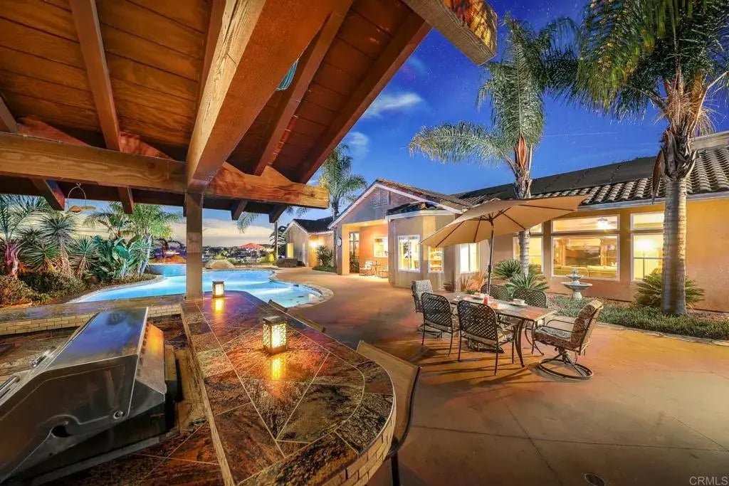Welcome to Rural living in the Michael Crews Estates where you will discover executive size lots and beautiful views. This Heston V model home has 4 bedrooms 3 Bath has just under 3500 SF of open concept living on 2.35 useable acreage. The kitchen has dual ovens, electric stove top, walk-in pantry, center island and recessed lighting open to large, vaulted family room with fireplace. There is a formal dining room and Living room off the formal entry. 3 nice-sized bedrooms, on separate sides of the home with full bath. Other full bath has pool access. The home also features 20x20 ceramic tile floors, whole house fan, fully paid Sunrun solar panels The 6-car attached garage has so much potential (gym, possible ADU Conversion, Man Cave), plus overhead garage storage, Peek a Boo Ocean View on a clear day. Gorgeous sunsets. Dual ovens, coffee bar, vaulted living room with fireplace, X large laundry room with sink and extensive storage cabinets including separate linen cabinetry. Outside enjoy the family sized BBQ island with custom built gazebo, island includes built in BBQ, burners, sink refrigerator, island seating, lighting, and custom stonework. Sparkling pool and jacuzzi with stone accents and pony wall surrounded by flagstone coping. Property is partially fenced with vinyl and chain link, several spots where you could build a barn, workshop or an ADU and JR Adu, recreational vehicle parking and more. Property is several mature avocado trees and citrus. Lots of useable land to add to your grove, sports court, workshop and more.