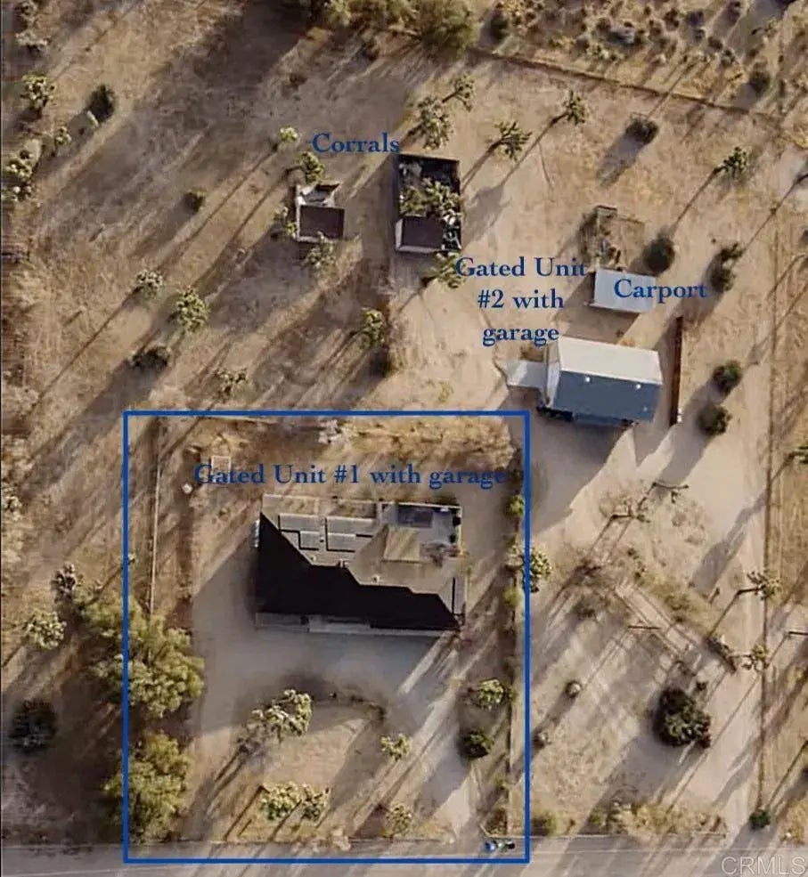 Discover 2 homes on stunning 2.5-acre desert oasis & huge RV garage. Location, location, location and VIEWS. Joshua tree laced corner lot in a highly coveted neighborhood surrounded by iconic jumbo rocks, mountains, and lush Joshua trees! With over $65k in recent upgrades, solar power included (solar paid off at sale price +), and endless possibilities for rental income, an art/yoga studio, or retreat, this serene retreat is a stargazers dream. Just minutes from vibrant local hotspots yet offering ultimate privacy, this property features TWO updated private detached homes, including a spacious main house with 2 bedrooms and a large additional bonus room (could easily be converted to third bedroom), and a newly permitted ADU home and garage in a charming 1,000 sq. ft structure. Both properties conveniently have a garage and address with city and are separated by fencing, truly private! TOURS MUST BE SCHEDULED AND APPROVED WITH A REAL ESTATE AGENT, DO NOT VISIT PROPERTY WITHOUT APPROVED SHOWING AND ALSO SUPERVISED BY YOUR AGENT. Dont miss this rare opportunity to create your own private paradise in the heart of the high desert! Square footage and bath numbers are both units combined.
