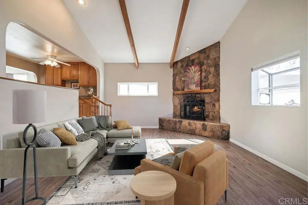 Welcome to this inviting 4-bedroom, 2-bath home with a flexible bonus room perfect for an office, nursery, playroom, or craft space. The living room boasts a beautiful bay window, a cozy fireplace, and wood blinds, creating a warm and welcoming atmosphere. The kitchen is a functional space for cooking and gathering, featuring a 4-burner gas stove with an extended center burner, a new dishwasher, ample cabinet and countertop space, and a layout that opens seamlessly to the step-down family/dining room. With its vaulted ceiling, wood beam accents, and a second fireplace with a large hearth, this space is perfect for entertaining or relaxing. French doors lead to the expansive backyard, complete with a built-in BBQ area and lush bushes that provide privacy. Additional highlights include an indoor laundry room, updated bathrooms, some dual-pane windows, a tankless water heater, solar power, and a repiped plumbing system. The detached 2-car garage adds convenience, while the homes thoughtful updates and charming features make it truly special. Dont miss this opportunity to own a well-maintained, versatile home with plenty of space for living, working, and entertaining!