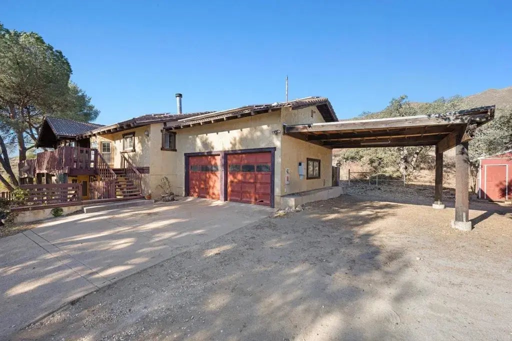 What an excellent opportunity to get a large 3,000sf Home and huge lot (over an acre) For Under $850K!! This lot is set up for horses, has potential for additional units on the land, and is only about 35 minutes east of downtown San Diego! This home has great bones with beautiful wood beam vaulted ceilings, floor to ceiling picture windows, grand stone fireplace, a chef's kitchen with tons of storage, an extra large primary suite with walk in closets and ensuite bathroom, a den, a great room with a full bar, deep and wide 2 car garage with an additional oversized carport, and much more! The yard and lot has gorgeous views of the meadows and the Cleveland National Forest mountains. Such a wonderful piece of country land, still close enough to all the amenities of modern living! This fixer can be transformed into a stunner, with lots of value to be had. Paid Solar & Well water!