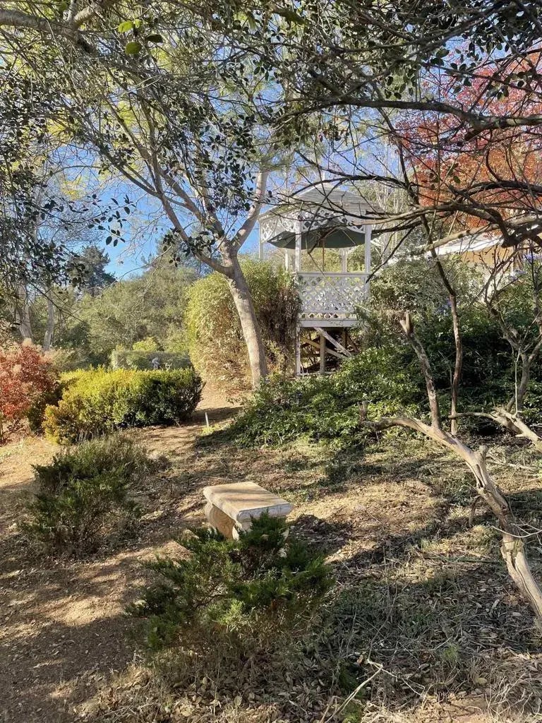 TWO HOMES ON ONE LOT! Gorgeous garden like setting. Panoramic hillside and valley views. Benches line the pathways through the garden for rest and reflection. A gazebo for intimate gatherings with beautiful views and light breezes. A wall of windows looking out to the hillside while flushing the home with light. Open beam ceilings, wood flooring, huge wood burning fireplace, all lend to the cozy feeling of this unique, semi circular living area. This 3 bedroom 2 bath, with an office/library area, a 2 car attached garage including an un permitted office and full laundry offer amble space for comfortable living. The ADU is steps away through a fenced yard for maximum privacy. Open living room, dining and kitchen, 2 master suites, and laundry room in 1152 sq.ft. Electricity is supplied to both homes from the owned solar system on the main house. Excellent opportunity, don't miss it!