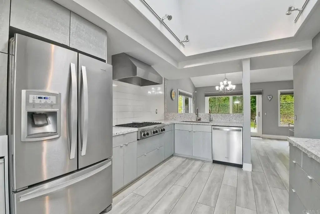 This stunning residence has undergone a complete, magazine-worthy renovation, earning a feature in Better Homes & Gardens. Previously owned by an interior designer, the home has been meticulously remodeled to perfection, sparing no expense. This ultra-chic single-story sanctuary boasts soaring ceilings and is set on a generous, private lot at the end of a serene cul-de-sac. Upon arrival, youre greeted by a gated courtyard entrance, leading into a bright, crisp, and modern interior. The current owners thoughtfully expanded the home, adding a bedroom & family room with a built-in refrigerator, counter space and a separate entrance, making it ideal as a guest suite, home office, or family room. For additional flexibility, this space, along with an adjacent bedroom, can be completely locked off from the main living area. Inside, the home is flooded with natural light from over sized skylights and vaulted ceilings, creating an unparalleled sense of spaciousness in the living room, dining room, and master suite. Every detail has been upgraded, from the artisan-crafted all-wood windows and doors, high baseboards, and luxurious quartz counter tops. The master suite offers a spa-like retreat with an enlarged shower, while the chefs kitchen is a culinary dream, equipped with a 6-burner stove top, expansive quartz counter tops, and modern finishes. Throughout the home, youll find designer touches, including stunning light fixtures and custom glass-paneled entry door and more. Practical upgrades abound, including new copper wiring, a state-of-the-art central air conditioning system, a