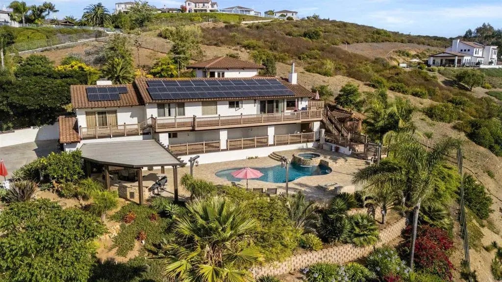 VIEWS! Lives like a single level! ADU! 2 parcels of land on almost 2.71 acres! Discover an unparalleled retreat at this extraordinary estate nestled on two parcels of buildable, beautiful land which are fully fenced and gated. The adjacent parcel has beautiful views of the ocean! Located in the foothills of Southwest San Marcos, this home is perched at the end of the street offering panoramic views and ultimate privacy. From the moment you enter through custom artistic glass French doors and step onto wood grain tile flooring, the home impresses with its attention to detail and luxury finishes. The kitchen is a culinary masterpiece with two islands, custom cabinetry, and high-end appliances including a KitchenAid built-in fridge, Wolf cooktop, dual wall oven, warming drawer, beverage fridge, leather-finished stone countertops, and a hardwood butcher block. Entertain effortlessly in the game room, complete with a built-in bar featuring a sink, fridge, and blender station, as well as a cozy fireplace and access to a deck overlooking the serene landscape. Retreat to the primary suite boasting vaulted ceilings, a private balcony, a whirlpool soaking tub, walk-in shower, dual vanities, and a spacious walk-in closet with built-in storage and a folding table. The upstairs office offers a productive space with custom built-in desks, vaulted ceilings, and its own private deck. Outside, enjoy resort-style living with a pool and spa featuring a spillover waterfall, surrounded by a paver patio and complemented by a built-in BBQ, sink, fridge, and an aluminum wood patio cover. The pool