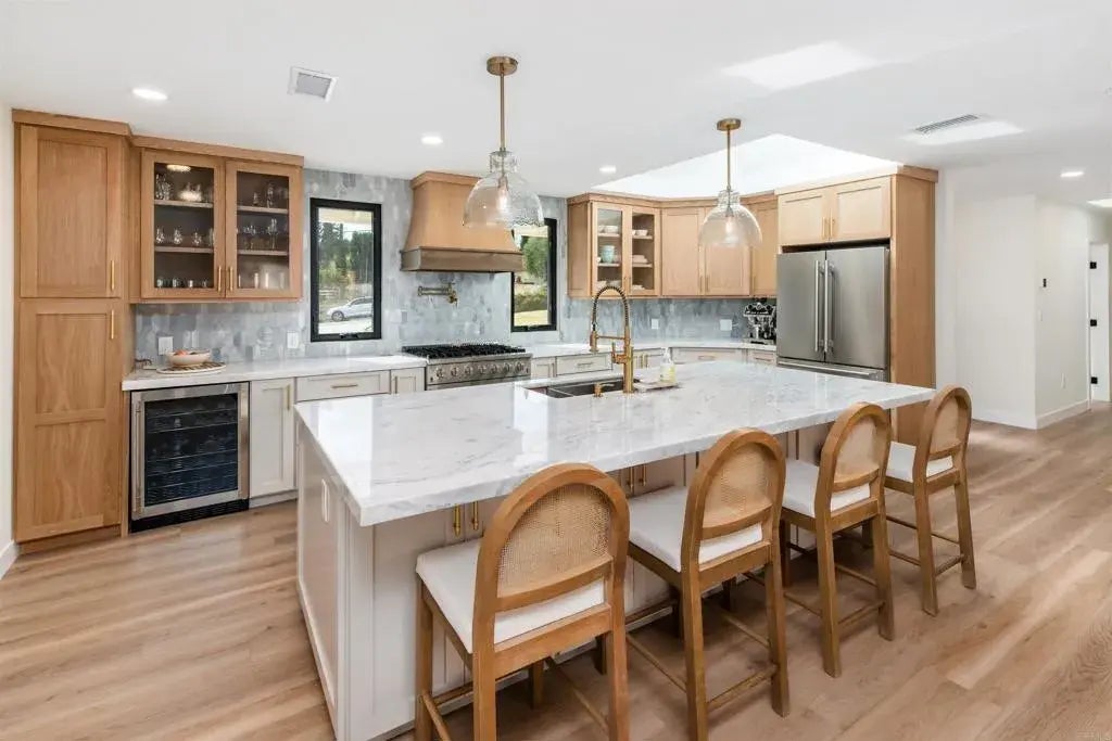 Exquisite single-level ranch-style home in highly sought-after Old Belvedere Estates community of Poway! Set on an expansive 2/3 acre corner lot along a peaceful cul-de-sac, this beautifully remodeled residence seamlessly blends contemporary elegance and timeless charm. A striking first impression begins with the home's enchanting curb appeal, framed by mature oak trees and a welcoming brick front porchan idyllic spot to pause and take in the serenity before stepping inside. The thoughtfully curated interior showcases an open-concept design, where impeccable craftsmanship and upscale finishes elevate every space. Wide-plank waterproof LVP flooring flows harmoniously throughout, while newly installed sliding glass doors and expansive windows bathe the home in natural light. Beyond the inviting entryway, the heart of the home unfolds in the great room, a seamlessly integrated space where the kitchen, living, and dining areas unite for effortless everyday living and sophisticated entertaining. The chefs kitchen features marble countertops and backsplash, custom white oak cabinetry, and premium appliancesincluding a 36 range, pot filler, wine fridge, and a walk-in pantry accented by modern brushed brass finishes. A generous island with bar seating serves as both a stylish focal point and a functional gathering space, while a skylight bathes the room in natural light. Anchored by a statement fireplace, the living room exudes warmth and refinement, offering a cozy retreat. Expansive bi-fold sliding glass doors create a seamless transition between indoor and outdoor living, openin