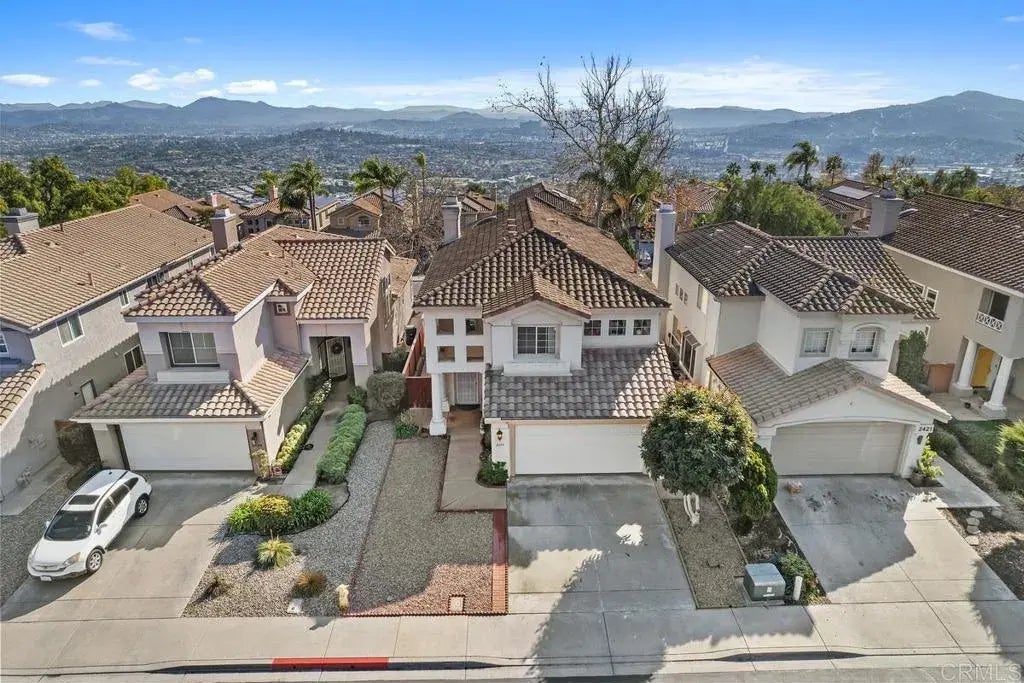 Amazing opportunity and new price! 4 bedroom VIEW home in desirable gated Emerald Heights on the market for the first time! This home is well-maintained and features vaulted ceilings and the kitchen is upgraded with granite countertops and luxury vinyl plank flooring. The beautiful home is light and bright and the cozy family room features a fireplace. All four bedrooms are upstairs with a spacious primary suite with walk-in closet, large shower, soaking bathtub and a sliding glass door to the view balcony. Three additional bedrooms share a hallway bathroom with shower/bathtub and the laundry room is on main level. The south-facing backyard is private and low maintenance with fruit trees, perfect for entertaining guests and enjoying beautiful sunset skies.Equipped with a 2 car garage and A/C. Emerald Heights is renowned for its amenities including a guarded entrance gate with 24/7 security, an Olympic-size swimming pool, spa, wading pool, shaded playground, multiple sport courts, neighborhood parks, fitness center and clubhouse. Zoned for highly desirable San Marcos schools, including the newly rebuilt and top-rated Richland Elementary School. Conveniently located near the 15 and 78 freeways, Palomar Hospital, Kaiser Hospital, Cal State San Marcos (CSUSM), and Palomar College.