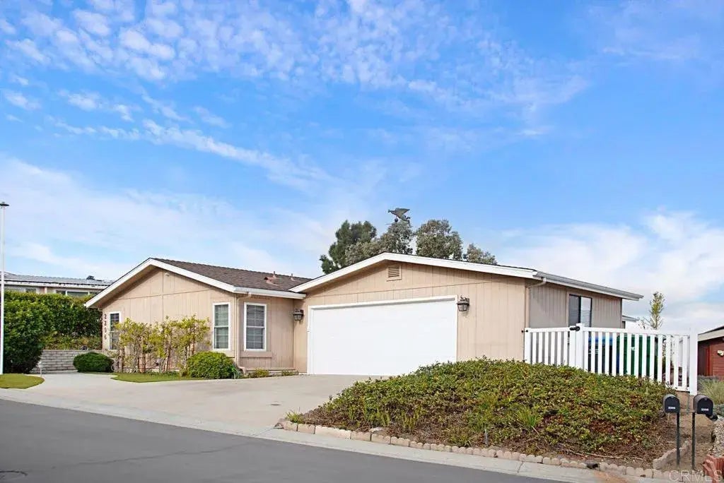 Beautiful manufactured home on owned land in a gated community! WOW, what a VIEW! Naturally light and bright home sits at the top of coveted 55+ community of Camino Hills. This private, spacious single story home features north-east views of Carlsbad hills and city lights from the living and dining areas, a large living room with a brick fireplace, high ceilings, and vinyl-wood-like flooring throughout. Kitchen boasts stainless steel appliances and butcher-block countertops. Both bedrooms have their own bathrooms. Laundry room is connected to a two-car garage with lots of storage. Enjoy a morning coffee, afternoon tea, or an evening beverage on a Trex-deck gazing at the panoramic views of the calming hills. Short stroll to the Club House, community pool, spa, tennis courts and plenty of guest parking.