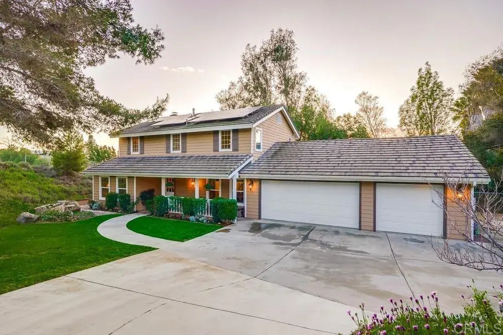 Welcome to this stunning two-story home nestled in the picturesque community of Fallbrook, California. Situated on a sprawling one acre lot, this four bedroom, two and one-half bathroom residence offers the perfect blend of comfort and tranquility with breathtaking views of the rolling hills. The property is beautifully landscaped, creating a serene and inviting atmosphere from the moment you arrive. The well-appointed kitchen features modern appliances, ample counter space. The cozy family room, conveniently located just off the kitchen, is the perfect place to relax and unwind. Featuring a charming wood-burning fireplace, it creates a warm and inviting atmosphere, ideal for cozy evenings with family and friends. French doors open up to the backyard oasis, seamlessly blending indoor and outdoor living. The separate dining and living rooms gives you plenty of room to spread out in the home. The large primary suite provides a peaceful retreat with stunning views of the surrounding hills, a walk-in closet, and an en-suite bathroom with dual vanities and a separate shower. The additional three bedrooms offer plenty of space for family or guests. Step outside to your own private oasis. The beautifully landscaped backyard features a sparkling pool with an attached spa and a wonderful outdoor living space, perfect for relaxing or hosting summer gatherings. With a large covered patio, you can enjoy alfresco dining while taking in the serene, panoramic views. This home also boasts an oversized 3-car attached garage, providing ample room for your vehicles, storage, or even a worksho