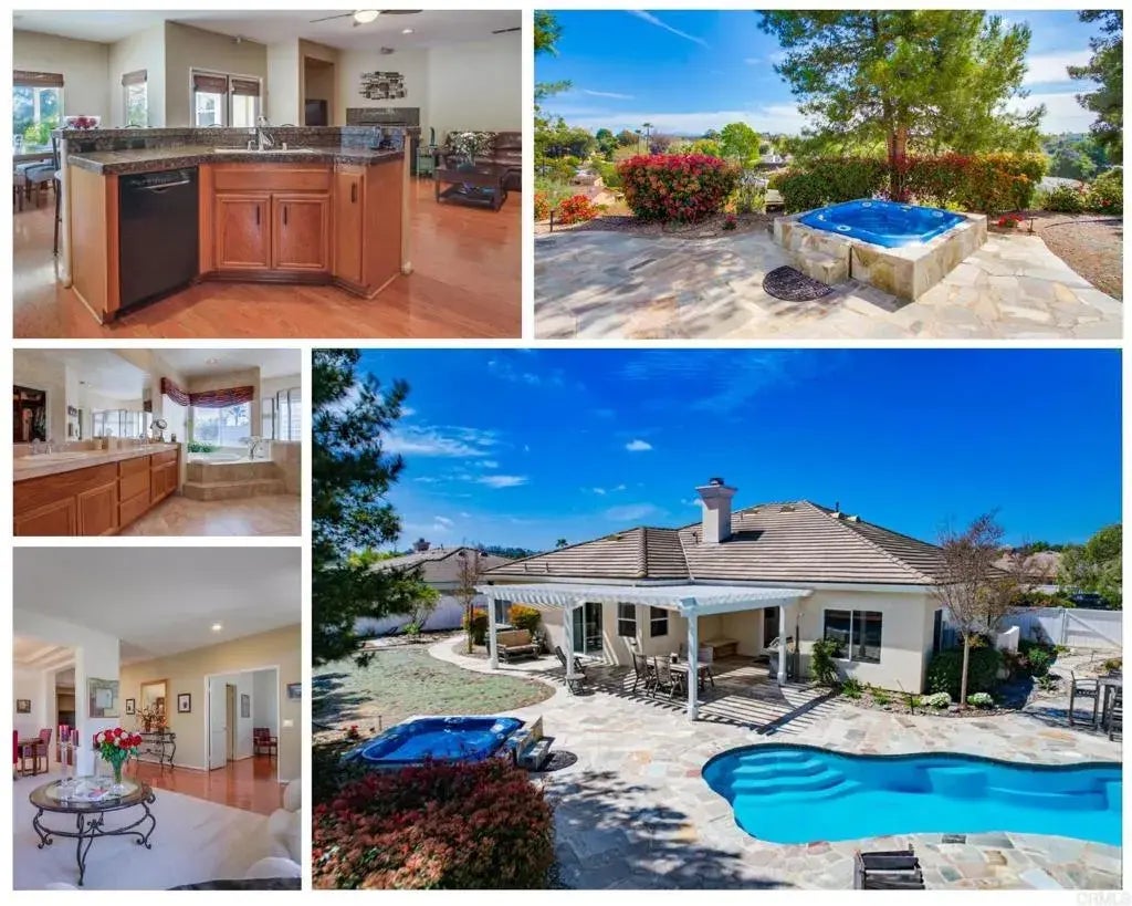 Enjoy this Fallbrook open-concept single-story pool home with owned solar while viewing the unobstructed sunrise and hillside/mountain views to the East. Situated on a half-acre lot at the peak of the hill on a quiet street, stands 2162 Knollwood Avenue. This home has been lovingly cared for by its original owners since it was built in 2001. The inviting curb appeal of a low maintenance drought-tolerant front yard features a wide flagstone walk to its front door to welcome you and your guests. Upon stepping into the spacious entrance, the formal living room to the left is bathed in natural light and opens into the dining room adorned with a coffered ceiling. In the heart of this home is the Great Room which includes the Family Room with fireplace, Breakfast Room with views to the mountains, and a Kitchen with angled island and bar height counters allowing the chef to connect with family and friends, as they socialize or watch TV. The kitchen with its granite tile counters includes double ovens, electric 5-burner glass cooktop, microwave, quiet dishwasher, double sink with 1-hp disposal, and refrigerator. In addition, the French doors to the back patio allow for great indoor/outdoor entertainment throughout the Great Room and backyard. The primary suite includes a spacious professionally organized walk-in closet, and a spa-like bathroom with faux painted walls, double sink marble vanity, soaking jacuzzi tub, and an over-sized glass enclosed shower. In all, there are another three bedrooms (one could be an office), plus another two bathrooms with double sinks in each. The lau