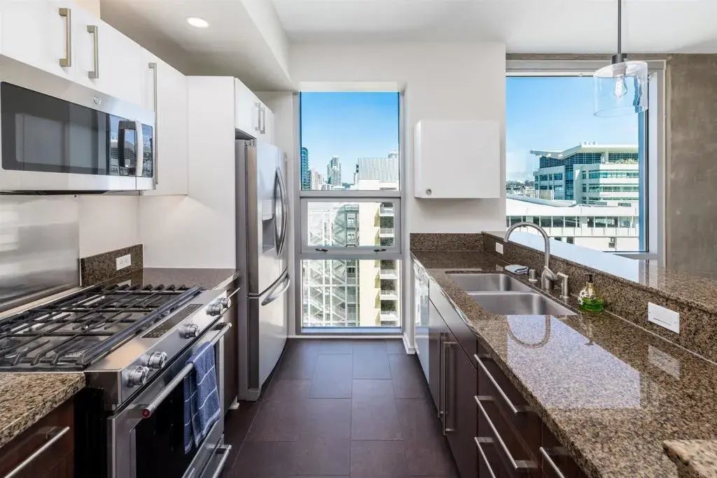 Bright and Modern Corner Unit in East Villages Sought-After ICON Building! This radiant 2 bed, 2 bath condo offers vibrant city living, blending modern style and comfort in an incredible downtown location. With Petco Park just moments away, the San Diego Public Library within easy reach, and countless restaurants, bars, and grocery stores only steps from your front door, youll also enjoy the convenience of the nearby San Diego Trolley stop and a quick trip to the famous Gaslamp Districtputting the best of San Diego right at your fingertips. Step inside to a bright, sun-drenched space, where floor-to-ceiling windows frame sweeping city views and flood the home with natural light. The freshly painted interior, refinished hardwood floors, and plush new carpeting in both bedrooms create a crisp, move-in-ready feel, while exposed concrete walls and contemporary finishes add depth and modern style. The thoughtfully designed layout seamlessly connects the spacious living area to the well-appointed kitchen, creating the perfect space for entertaining or enjoying a quiet night in, with a private balcony. The kitchen boasts granite counters, breakfast bar seating, and SS appliances, including a new refrigerator and dishwasher installed in 2024. Both bedrooms are bathed in natural light, with floor-to-ceiling windows, while the primary suite offers a generous walk-in closet and an ensuite bath with dual sinks. Additional highlights include a new HVAC system installed in 2022, in-unit laundry with a washer and dryer installed the same year, secured tandem parking for two cars, and an e