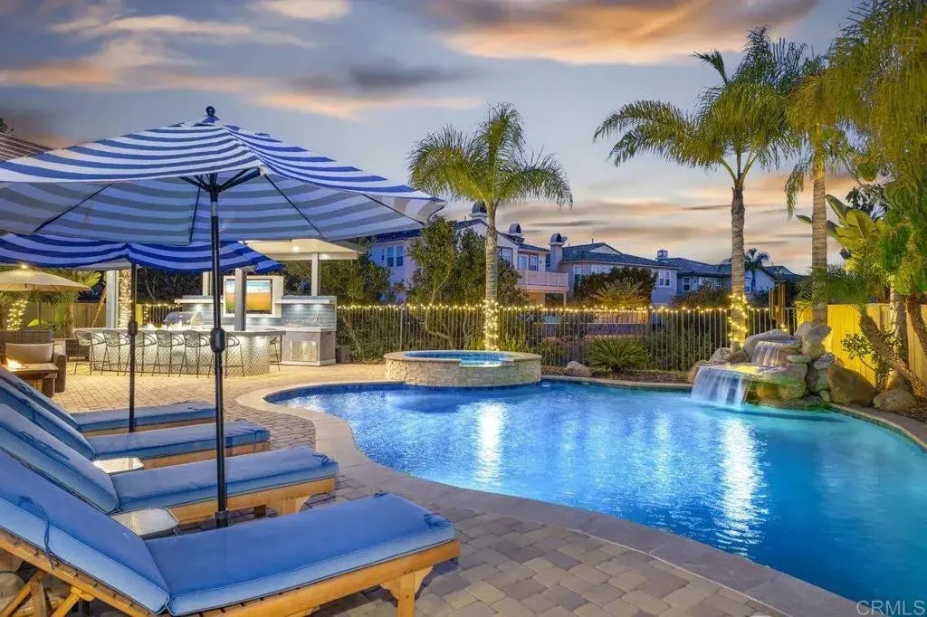 Exceptional entertainers dream on an oversized quarter-acre lot in highly desirable Torrey Del Mar! Renovated from top to bottom with over $600k+ in upgrades, this stunning home seamlessly blends warmth, modern elegance, and everyday comfort. Nestled on a rare, oversized quarter-acre lot, this 5-bedroom, 3-bathroom residence features a bright, open layout with a versatile upstairs loft and luxurious designer finishes throughout. The main level showcases rich, dark hardwood flooring, adding sophistication to every living space. At the heart of the home is the gourmet kitchen, thoughtfully designed with quartz countertops, white custom cabinetry, a striking blue center island with barstool seating, and a Hayley farmhouse sink. Premium appliances include a Wolf range and hood, Sub-Zero wine fridge, Miele dishwasher, and a paneled Jenn-Air refrigerator, creating a streamlined, high-end aesthetic. The custom walk-in pantry features quartz counters and stunning tile work for both beauty and functionality. Just off the kitchen, the dining area opens to the backyard through fully collapsing panoramic glass doors, creating effortless indoor-outdoor flowperfect for hosting gatherings. A full bedroom and bathroom on the first floor provide ideal accommodations for guests or multigenerational living. The downstairs bathroom includes designer tilework for a fresh, modern touch. Upstairs, the newly added loft offers flexible space ideal for a home office, media room, or playroom. Two additional secondary bedrooms are generously sized and filled with natural light, while a Jack-and-Jill l
