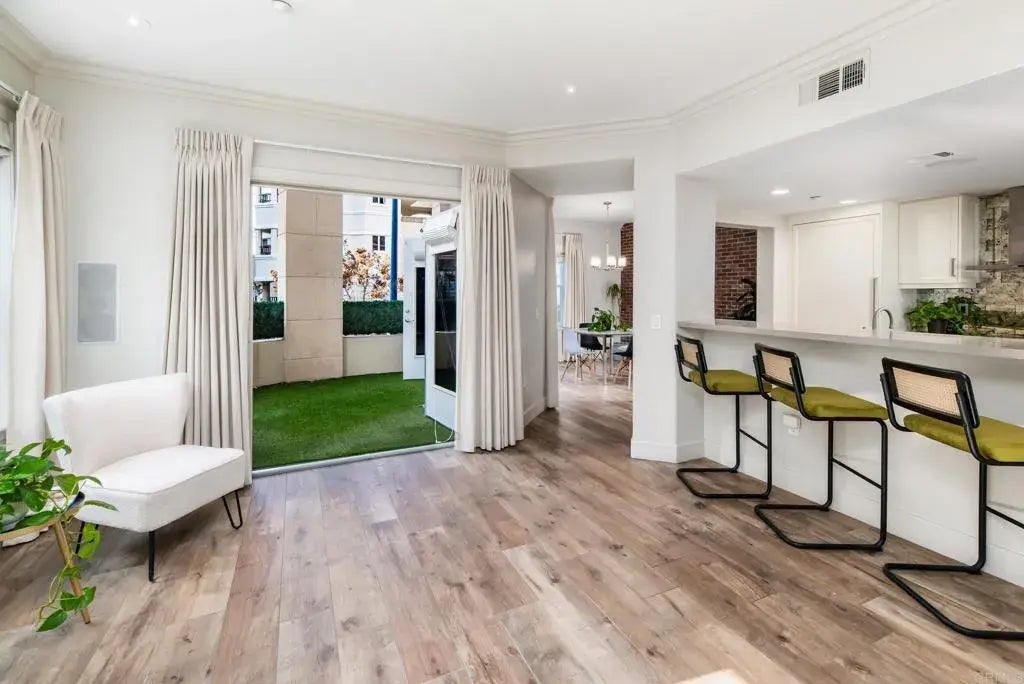 Nestled in the highly desired Marina District, this 2-bedroom, 2.5-bathroom corner condo offers a perfect blend of style, convenience, and privacy. Located at the southwest corner of Market & State, just blocks from San Diegos scenic waterfront, this two-level home captivates with its signature terrace and Mediterranean-inspired architecture. The main level boasts an open-concept living and dining area highlighted by charming brick walls and a stunning upgraded kitchen featuring stone countertops and high-end appliances, with dual French doors opening to a spacious terrace. Elevated above street level, the terrace provides a serene retreat with added privacyideal for morning coffee or evening gatherings. Upstairs, both bedrooms are designed for comfort, each boasting walk-in closets and en-suite bathrooms. The primary suite also includes a charming balcony, perfect for enjoying downtown views. Additional highlights include two assigned parking spots in a secured garage, ensuring convenience in the heart of the city. The building's amenities enhance the lifestyle, featuring a tranquil courtyard with a fountain, a clubhouse, a recreation room, a barbecue area, and a fitness room. Situated minutes from the vibrant Gaslamp District, Seaport Village, Harbor Marina, Petco Park, the Convention Center, and Little Italy, this residence offers the ultimate downtown living experience. Dont miss the opportunity to own this captivating home in one of San Diegos most sought-after locations.