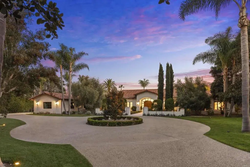 Privately gated within the prestigious Rancho Del Lago community, this 4-acre modern Mediterranean estate offers timeless design and refined living in Rancho Santa Fe. The nearly 8,000 sq ft single-level home features a flowing open-concept floor plan with light-filled interiors, generous en-suite guest bedrooms, dual offices, and a luxurious primary suite with spa-like bath, fireplace, and dual walk-in closets. A detached 1BR/1BA guest house provides private accommodation for extended stays. The gourmet kitchen is outfitted with Subzero, Wolf, and Miele appliances and opens to spacious living and dining areas that overlook the tranquil outdoor setting. A grand loggia with statement fireplace anchors the resort-style backyard, complete with a pool, putting green, bocce court, garden beds, and lush landscaping with over 140 orange trees. Set on 4 acres, the estate offers ample versatility and opportunity for a future owner to create their dream estate whether that be adding a tennis court, sport court, ADU, equestrian facilities, or whatever ones heart desires. Here, the possibilities are endless. Equipped with owned solar, backup generator, and a private well, this estate blends beauty, function, and convenience just minutes from the Village, Roger Rowe School, golf, and the coast.