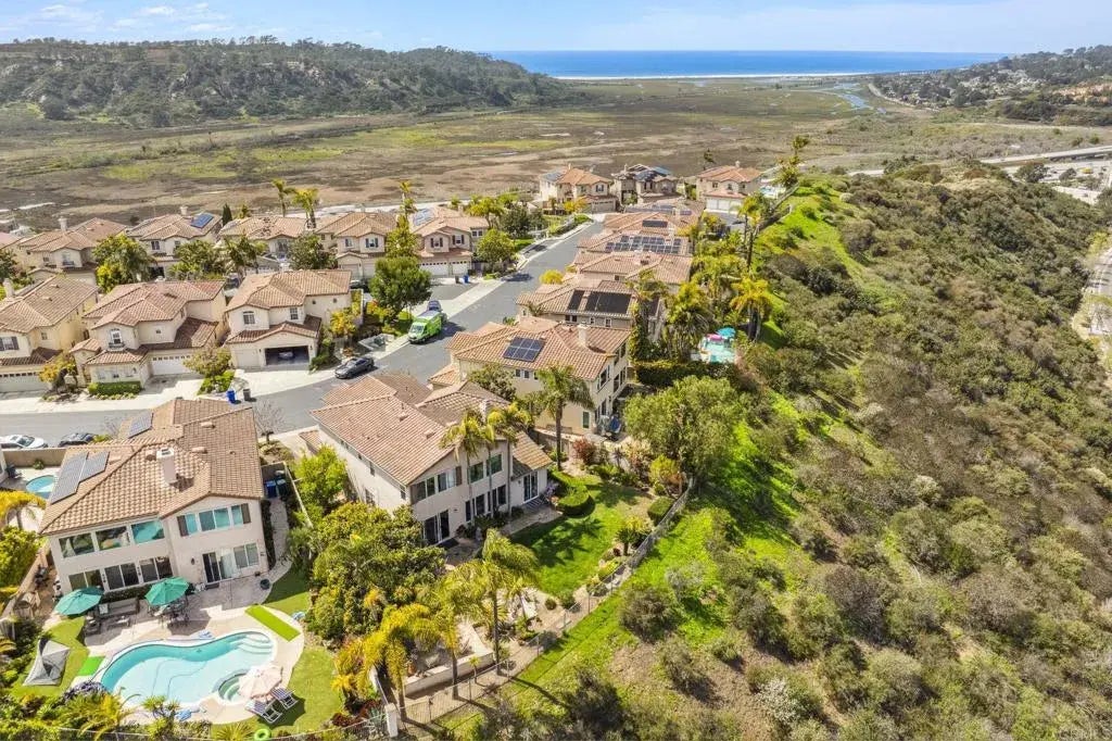 Perched atop a peaceful hill above the ocean in one of San Diegos most coveted locations, this exceptional 4 bedroom, 4 bathroom home is nestled within the prestigious gated community of Torrey Hills. Situated on one of the largest lots in the neighborhood, this inviting home offers privacy, panoramic canyon views, and a thoughtfully designed floor plan for modern living. From the moment you arrive, youre greeted by a gated paved courtyard, an expansive driveway, and lush landscaping that sets a tranquil tone. Inside, soaring ceilings and abundant natural light enhance the spacious layout, with refinished hardwood floors adding warmth and timeless elegance throughout. The main level includes a bedroom and full bath, ideal for guests, multigenerational living or a home office. The open-concept design seamlessly connects the formal living room, dining area, family room with cozy fireplace and built-ins, breakfast nook, and an oversized kitchen with an expansive center island, perfect for entertaining and everyday living. Upstairs, the primary suite is a private retreat, featuring a spa-like bath with a soaking tub, dual vanities, walk-in shower, and generous walk-in closet. Every window along the back of the home frames breathtaking canyon views, truly bringing the outdoors in. With an additional two bedrooms and full bathroom upstairs, there is more than enough room for all your familys needs. A loft with built-in cabinets and desk offers extra space for work, creativity and organization. Finally, step outside to your own private backyard oasis, where the possibilities are e