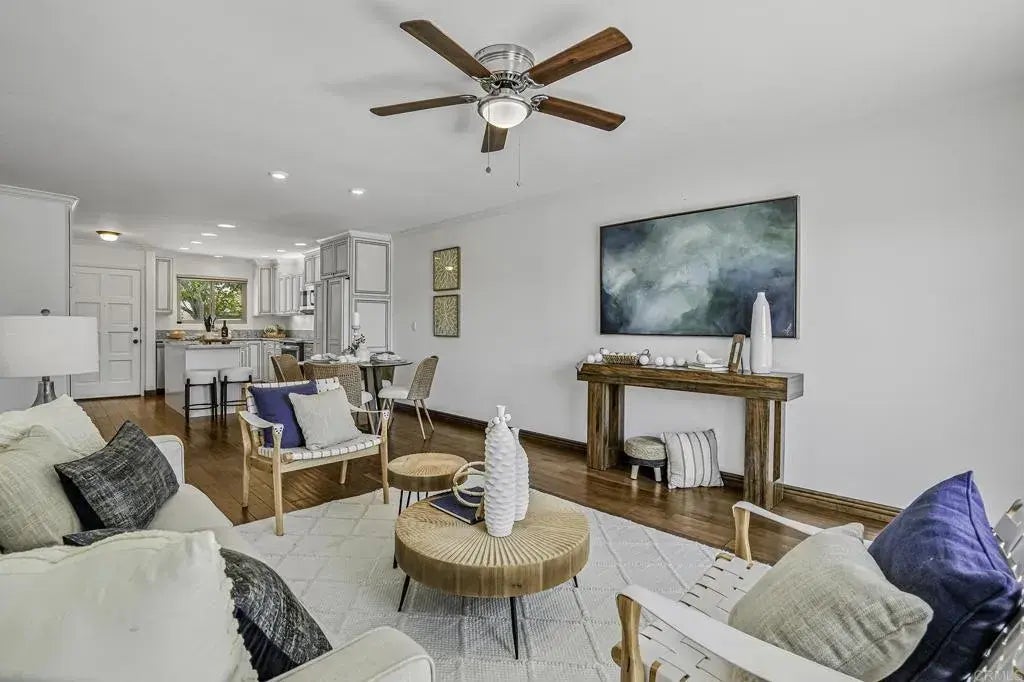Live a life of simplicity, sport, sun & fun in the desirable High Country Villas, a Spanish dream community for 55+ that has all the advantages & convenience of Encinitas coastal life, yet a close proximity to gorgeous woodsy Rancho Santa Fe. This sunny & bright 2 bed/2 bath villa will enchant with a combination of modern remodeling & a hint of European charm. Unlike many of the other units in the community, there are TWO patios for enjoying California sunshine, relaxing & entertaining: The front patio is a charming herringbone brick, where you can enjoy morning coffee in a rocker while you watch the mature front maple sway in the breeze. The private back patio has a no maintenance vinyl fence & faces a greenbelt walking/strolling path. Here you can enjoy barbecuing, relaxing or dining al- fresco. The kitchen has a brand new custom island with quartz counter in a gorgeous creamy neutral designed to coordinate with the existing french style cabinetry with self closing drawers. The refrigerator is veneered with matching cabinet faces to visually enlarge the kitchen space. In the entry across from the island, built-ins have been added all along the wall to create extra needed storage. Dishwasher, range, microwave are all new stainless steel. The wider plank WOOD floors are in a gorgeous chestnut tone. (If you're tired of seeing greige vinyl everywhere, these are the floors for YOU!) The primary bedroom has an ensuite bath with custom vanity/mirror, stone top counter, travertine flooring & European tiled shower surround. The secondary room can flex into an office or bedroom wit