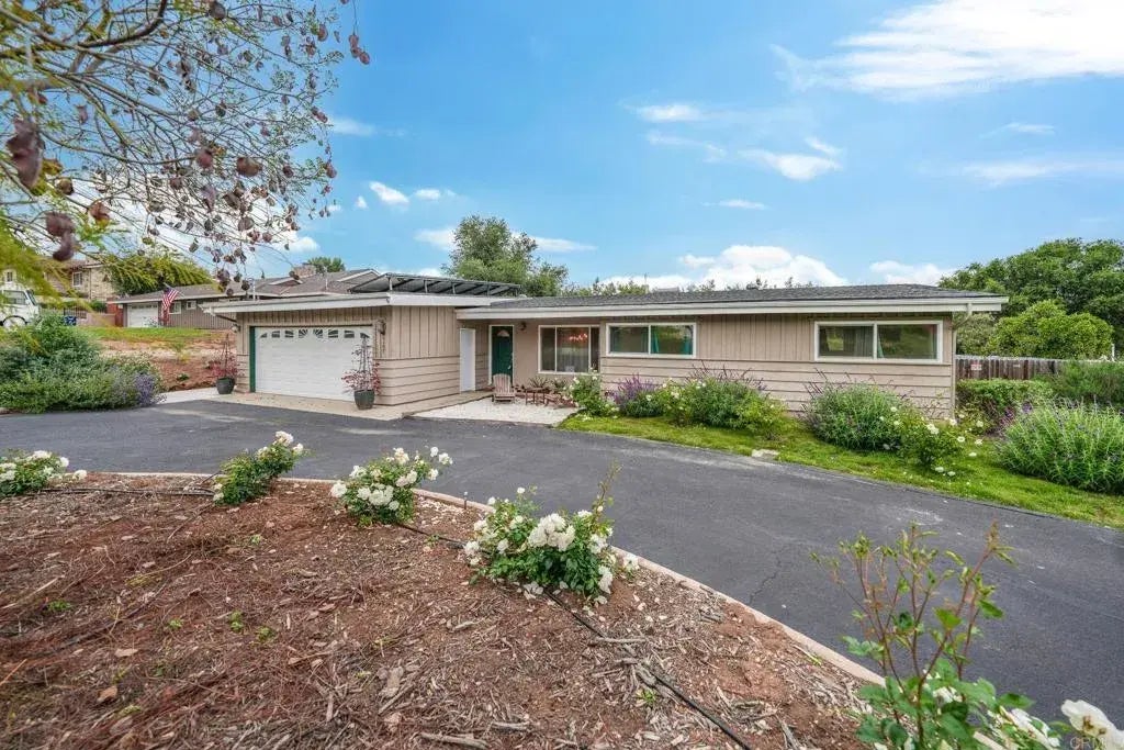 This single-story ranch-style home in South Escondido offers a bright, open layout with a kitchen that flows into the living room, featuring white quartz countertops, stainless steel appliances, and warm wood cabinets. Rich vaulted wood ceilings frame the cozy living room. Dual-pane windows and doors provide energy efficiency and a quiet interior. The home features a whole-house fan to take advantage of cool evening air, solar panels, central air conditioning, and an EV charger. Enjoy a large circular driveway, two-car garage, and well-maintained landscaping. The spacious backyard includes a large grassy area, fruit trees, covered patio, and a separate laundry room. This home is conveniently located near parks and shopping centers, has easy freeway access, and blends comfort, style, and functionality.
