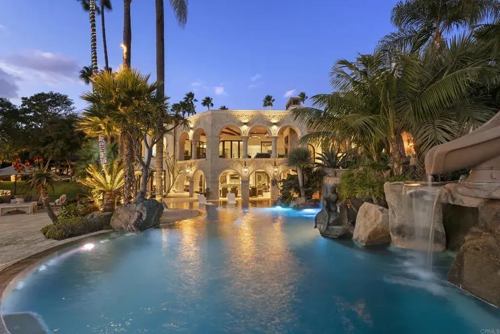 Nestled behind a grand, gated entrance, this private 6-acre Covenant estate in Rancho Santa Fe is a hidden treasure at the end of a secluded drive. Surrounded by meticulously manicured landscaping, soaring palms, flourishing vineyards, and a fragrant orange grove, the property emanates serene luxury. Perched atop one of the highest elevations in Rancho Santa Fe, the six-bedroom estate boasts commanding southwest views of the region, stretching to Black Mountain, UTC, and Mount Soledad in La Jolla. The main residence is an architectural masterpiece, offering four spacious bedrooms, a voluminous office, a walk-in wine cellar, a spa-like primary suite with two boutique showroom closets, and a gourmet kitchen. Perfect for entertaining, the home features an elegant bar, a comfortable family room, a massive game room, and a theater/gym. Outside, the resort-style pool dazzles with its breathtaking size and beauty, setting the stage for unforgettable gatherings. The guest house includes a full living room, kitchen, bedroom, and bathroom for ultimate comfort and privacy. Adding to its charm, there is a paddle court with viewing pavilion and the four-stall barn has been transformed into four luxurious casitas, ideal for hosting guests. A lush grass arena invites both children and adults to play and revel in the property's idyllic surroundings. This estate is a rare combination of privacy, elegance, and sweeping vistas, offering an unparalleled lifestyle in one of Rancho Santa Fes most coveted locations.