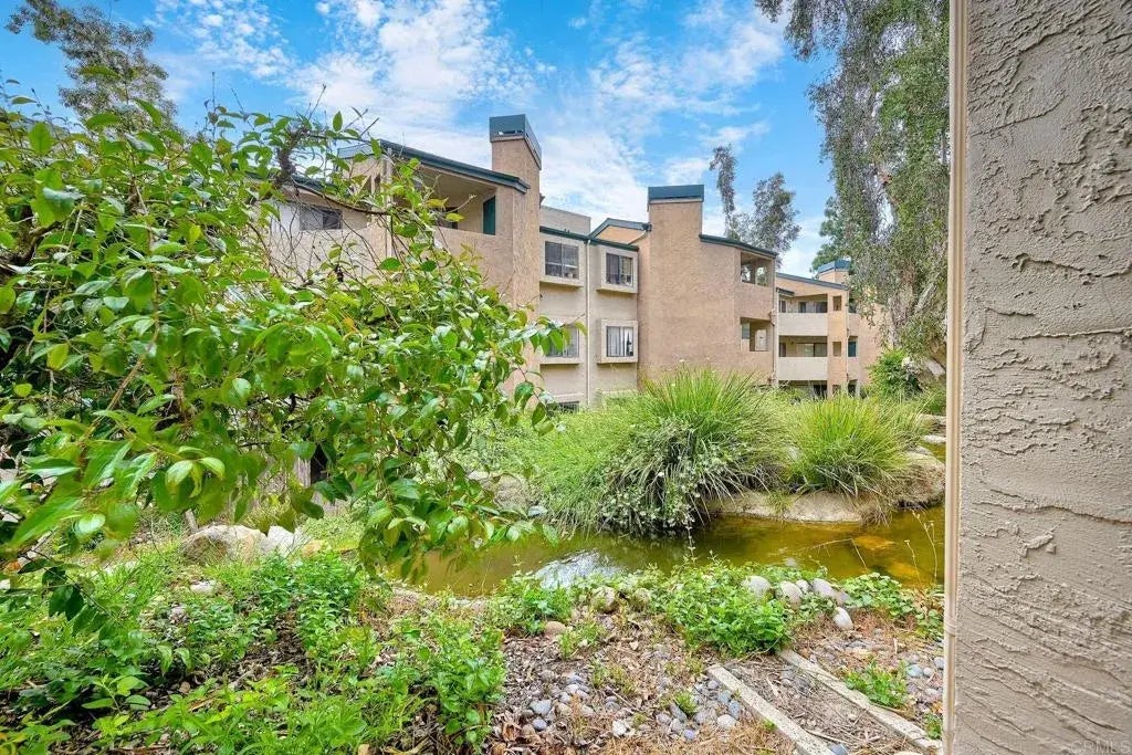 Adorable one bedroom condo for lease in the lovely Miramar Woods community. Great open layout with lots of windows adding light throughout. Updated kitchen cabinets and stainless appliances including refrigerator. Wood flooring throughout. Living room has gas fireplace and sliding door leading to covered patio overlooking a babbling brook and lush community landscaping. Washer/dryer hookup inside unit. Rent includes one car garage and additional open space with permit. Water & trash included in rent. Community pool and rec area. Conveniently located to 15 fwy, shopping, restaurants. You'll love living here!