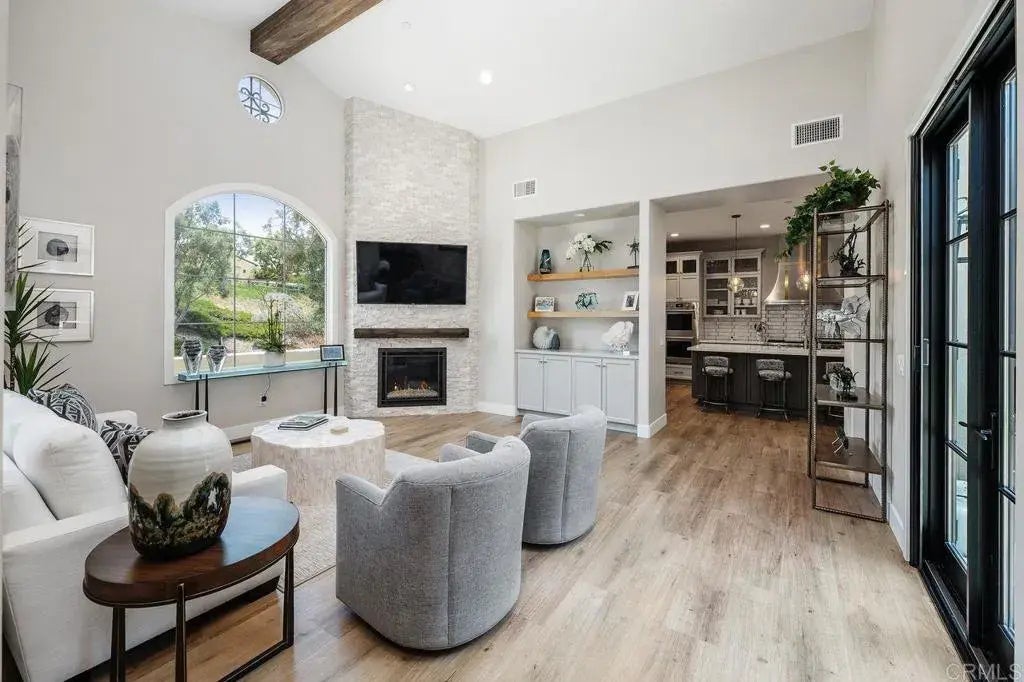 Welcome to resort-style living in the exclusive Santaluz community. Just minutes from world-class clubhouses a serene spa, fine dining, this beautifully renovated single-story home offers the perfect blend of comfort and sophistication. Completely updated, this 3-bedroom, 3-bath residence features stunning new flooring throughout and a fully reimagined chef's kitchen. Culinary enthusiasts will appreciate the expansive quartz countertops, top-of-the-line Wolf stainless steel appliances--including two double ovens, a 6-burner range with grill, and dual bottom ovens--custom cabinetry, an appliance garage with a pull-out beverage drawer, and a Sub-Zero refrigerator. The open-concept layout includes a spacious dining area and a light-filled living room with soaring cathedral ceilings and a cozy fireplace. French doors lead to a central courtyard, ideal for relaxing or entertaining in style. The generous primary suite offers a custom-designed walk-in closet, space for a sitting area or home office, private patio access, and a spa-inspired bathroom featuring dual vanities, a jetted soaking tub, and a separate shower. Additional features include: Updated bathrooms with new copper piping and whole-house water softener, Two-car garage with EV charging outlet, Plantation shutters in the bedrooms, dining area, and entry. New front courtyard landscaping and upgraded garage flooring, Retractable screens on three courtyard-facing doors, Cased windows in the living room and hallway. This home is truly turnkey--combining modern upgrades, timeless design, and an unbeatable location. Schedule