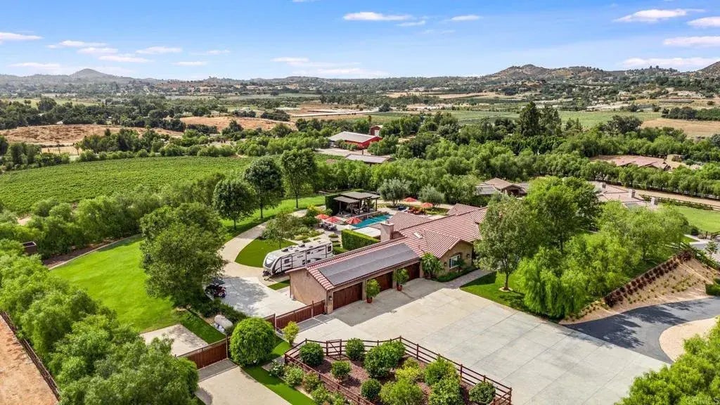 Welcome to this exquisite property that offers a blend of functionality, comfort, and entertainment. Fully remodeled in 2018, this home features an updated kitchen, family room, laundry room, and a sophisticated bar, ensuring modern living at its finest. The residence includes 3 bedrooms, 3 bathrooms, and an office, offering ample space for both relaxation and productivity. The kitchen is a chefs dream with a Subzero French door refrigerator, Subzero wine storage, and stainless steel Wolfe dual range burners. Through a hidden door you'll find the speakeasy bar area, custom built and designed for entertainment. The impressive 5,000 square feet of outdoor space includes a sport pool with a built-in table and stools, a covered lanai, two covered patios, an outdoor hot tub, three putting greens, a horseshoe pit and a 500-gallon propane tank. Designed for year-round enjoyment, the outdoor area features motorized blinds that offer shade in the summer and warmth in the winter. Enhanced with solar energy, the home includes 56 panels and a 400-amp service, making it both eco-friendly and cost-efficient. Additionally, the property is equipped with two 50 amp RV hookups and an RV clean out, perfect for accommodating recreational vehicles. Fruit lovers will appreciate the citrus, peach, Asian pear, pomegranate, and mature avocado trees. The backyard features high-quality Belgard pavers and 1,900 square feet of concrete with reinforced rebar. This home is an entertainer's paradise, offering unparalleled luxury and functionality in every corner. Dont miss the opportunity to make it yours