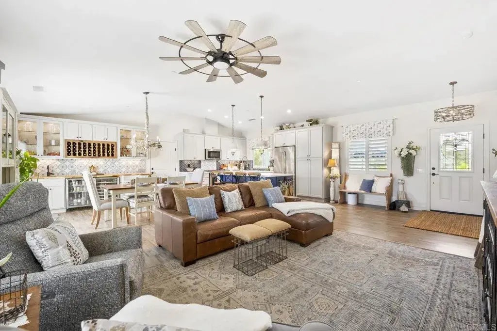 Welcome to this stunning custom-built modern farmhouse with owned solar situated on an all usable 2.18-acre lot. This one-of-a-kind home is a true showcase of craftsmanship and thoughtful design, where top-quality construction meets timeless elegance and energy-smart living. The open-concept living spaces feel both fresh and luxurious. Custom cabinetry, handmade locally, features soft-close doors, self-closing drawers, under-counter lighting, and even a handcrafted wine rack that can be reconfigured to fit your needs. The gourmet kitchen is equipped with quartz counters, custom backsplash, and a full suite of matching top-tier KitchenAid appliances. At the heart of the space, an oversized island with bar seating invites gathering and conversation. For the ultimate in entertaining, a dedicated drink station features dual wine and beverage refrigerators, a butcher block countertop, and a convenient sinkperfect for hosting in style. Durable vinyl plank flooring flows seamlessly through the main living areas, while brand-new commercial-grade carpet provides comfort in the bedrooms. The spacious primary suite includes a beautiful ensuite bath and large walk-in closet. The outdoors is equally impressive: a fully fenced backyard with low-maintenance vinyl fencing, perfect for pets and play. Fruit treesincluding fig, avocado, orange, lemon, and limeoffer fresh bounty year-round. The large, flat, graded lot offers endless potentialwhether you envision an ADU, a barn, a pool, or a horse corral, there's room to make it your own. This home is as smart as it is stylish. Sustainability f